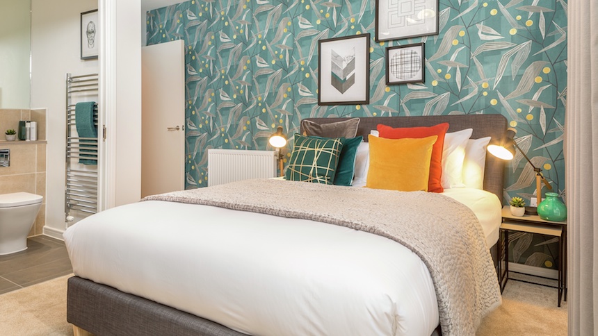 Bedroom one: “Bedroom one follows on from the lounge with its angular Harlequin wallpaper, whilst also adding a drop of gold to the mix. The offset artwork brings the modern element while the wall to wall curtains and stunning mix of fabrics in the dressing of the bed add the upmarket appeal.”