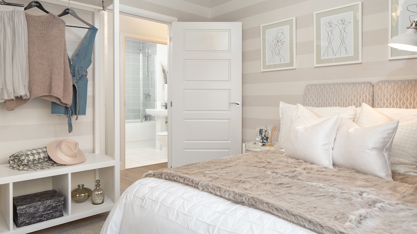 “The home is spacious, smart and contemporary” Dawn comments, “decorated in a mainly neutral palette of whites, ivory and greys, with a touch of navy blue.” A feature wall, adorned with a striking wallpaper design, gives visitors an idea of how they could choose to personalise their new home.
