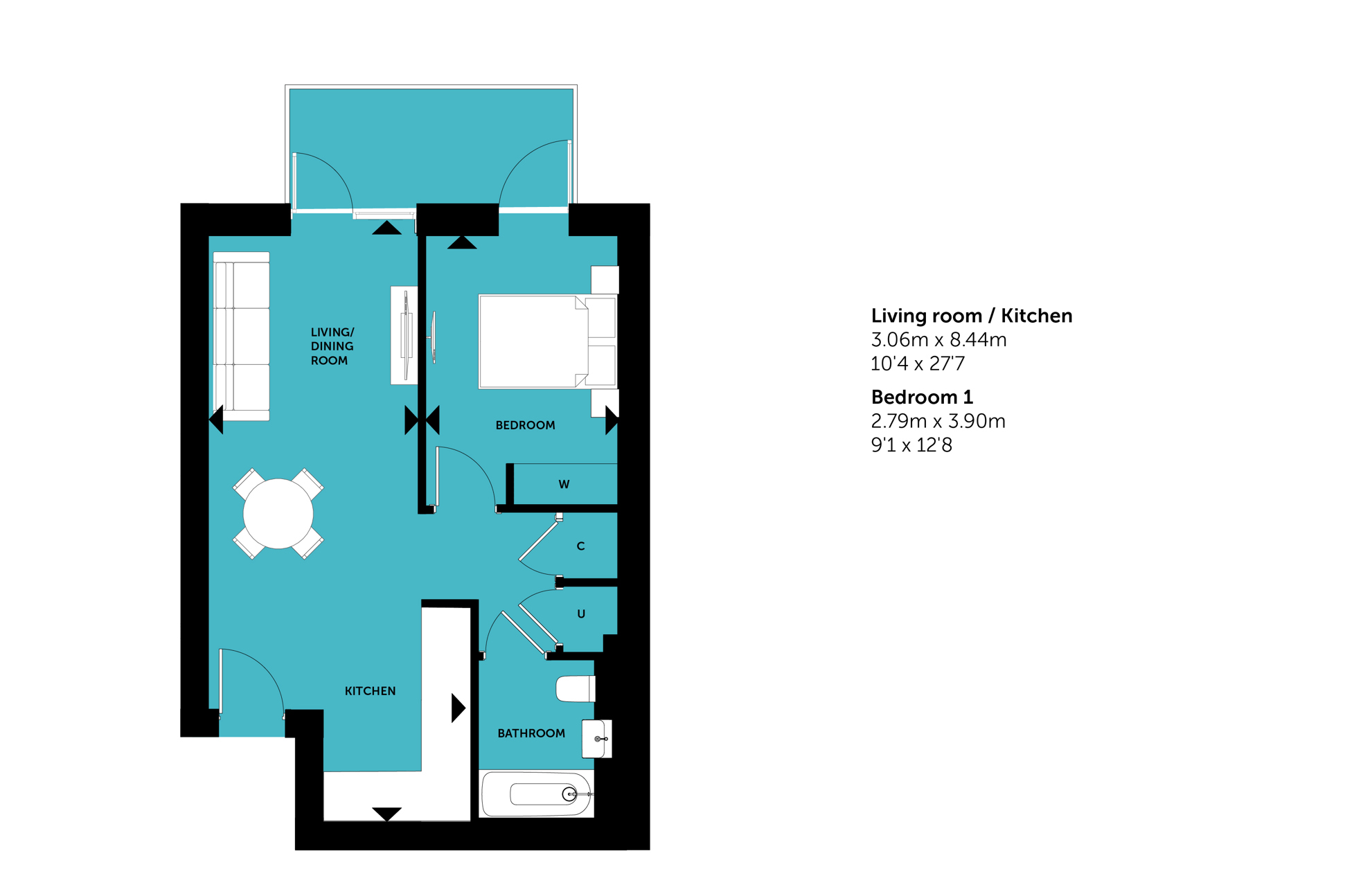 Featuring an open-plan living area with doors out to your balcony. The kitchen is fitted with an oven, induction hob and canopy extractor fan, and has a built-in fridge/freezer and dishwasher.