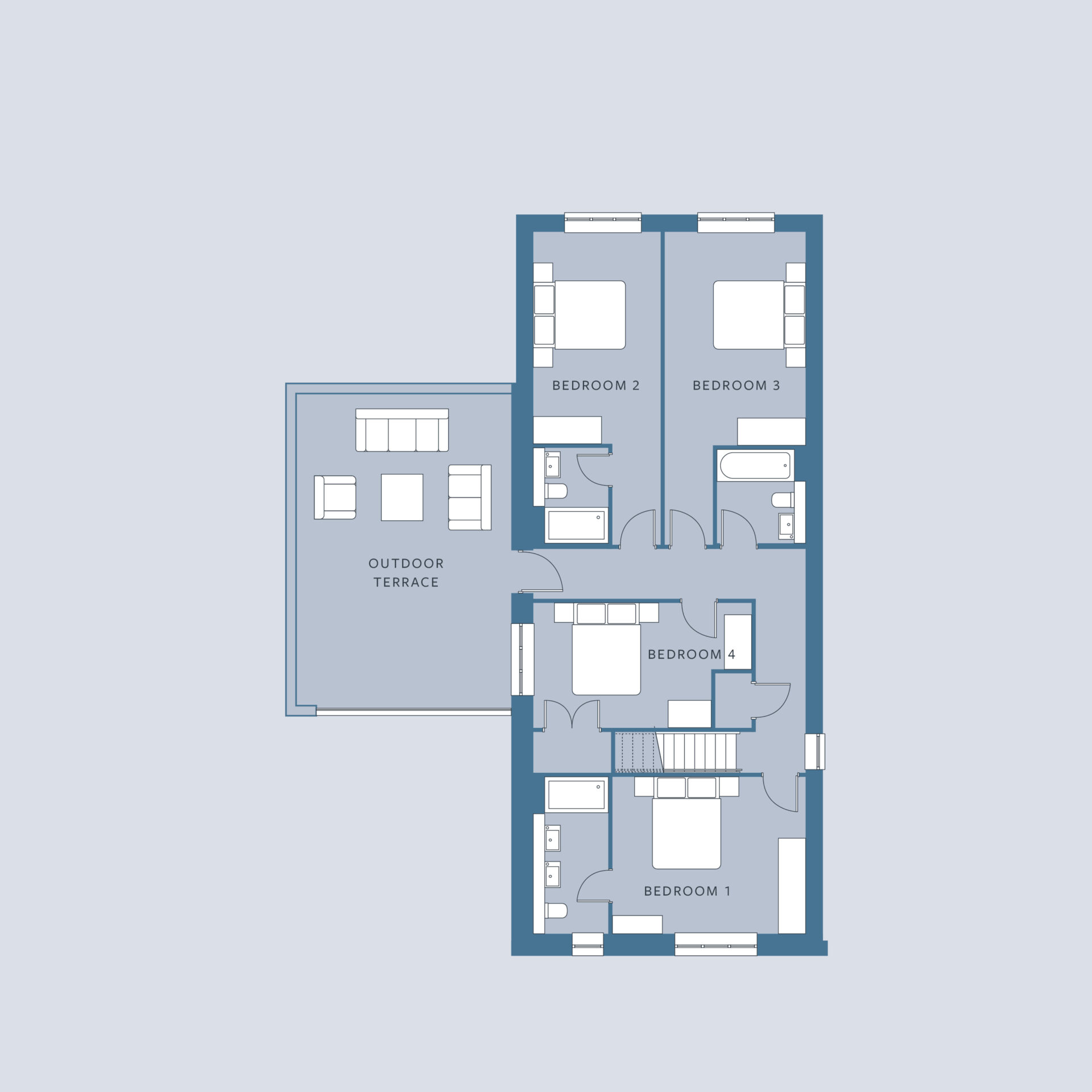 Upstairs are 4 double bedrooms, with bedrooms one and two each benefiting from an en-suite, as well as a family bathroom and access to the fantastic roof terrace.