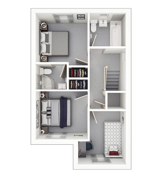 The Nevis is an attractive three bedroom home that features an open-plan kitchen and dining area, and separate living room and downstairs WC. Upstairs the principal bedroom and bedroom 2 benefit from fitted wardrobes. Principal bedroom with en suite shower room and family bathroom. French doors in the dining area open on to the garden.