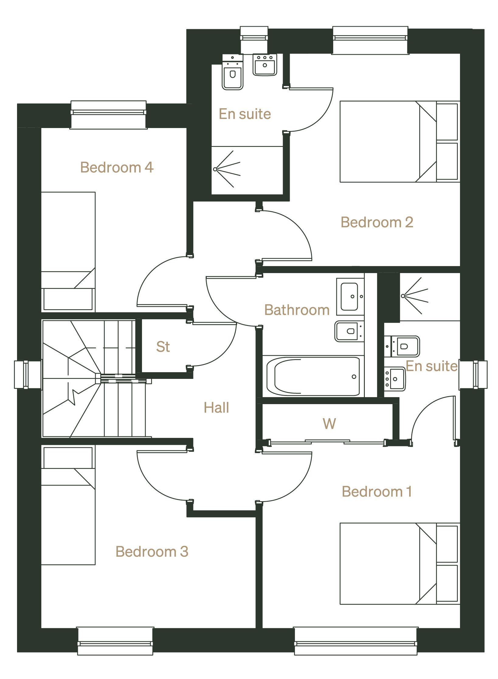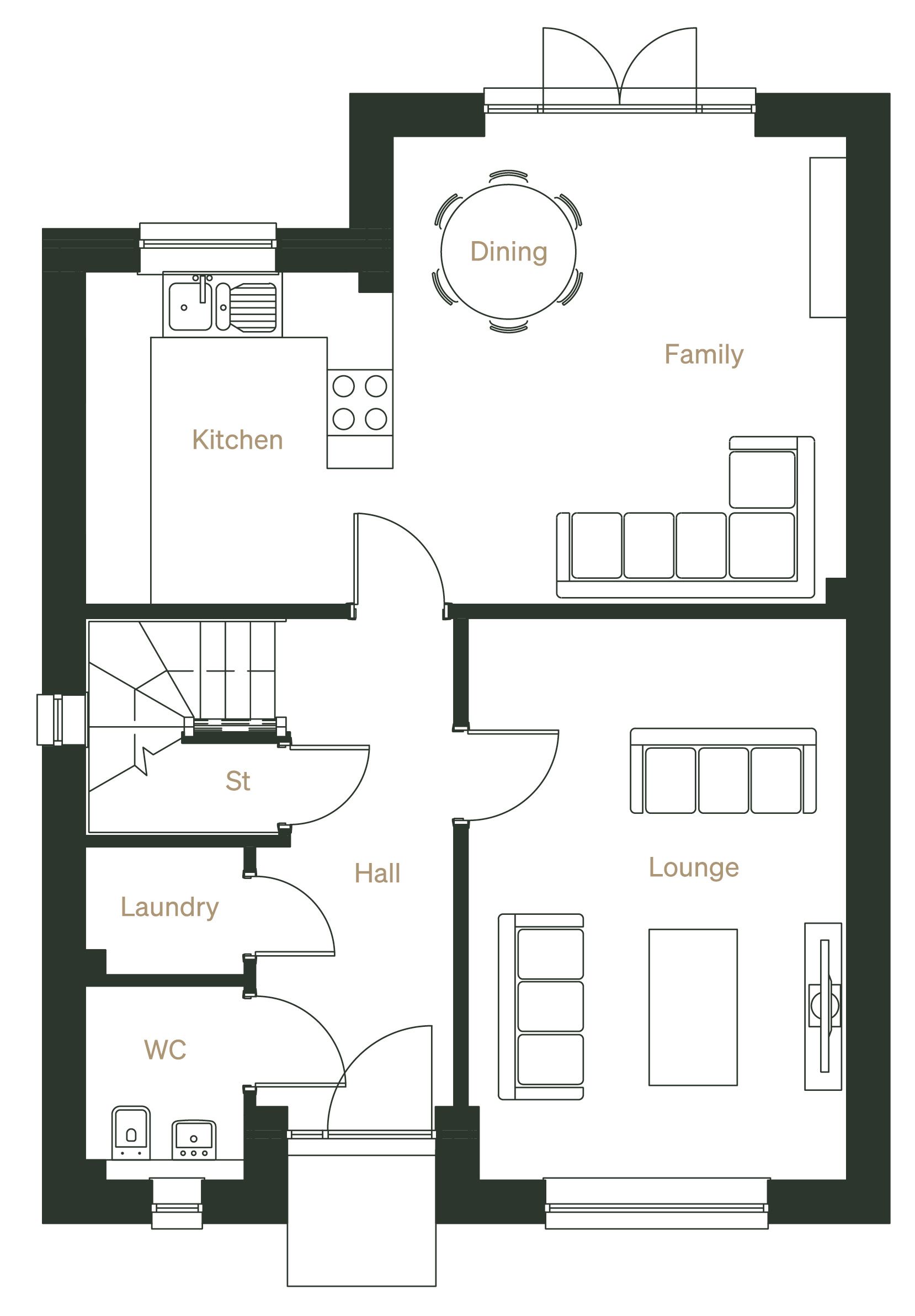The Blake offers luxury family living with a bright and spacious layout. The ground floor comprises a welcoming hallway, a separate formal lounge, an open plan dining kitchen with a family area that extends the width of the home, and French doors connecting to the private back garden. A downstairs WC, separate laundry room, and storage cupboard ensure maximum convenience.