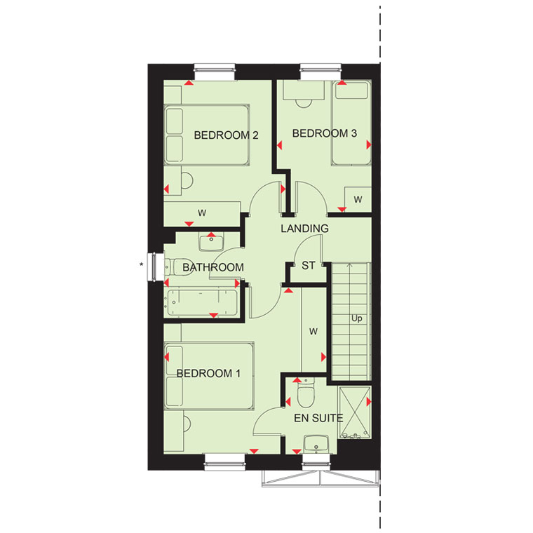 THE ELLERTON 3 BEDROOM HOME This bright, energy efficient family home is ideal for modern living. The spacious lounge is the perfect retreat after a busy day. The OPEN-PLAN KITCHEN features dining space and FRENCH DOORS leading to the garden. The bedrooms are close to the centrally located bathroom. The main bedroom benefits from an EN SUITE. The single could be used as a home office.