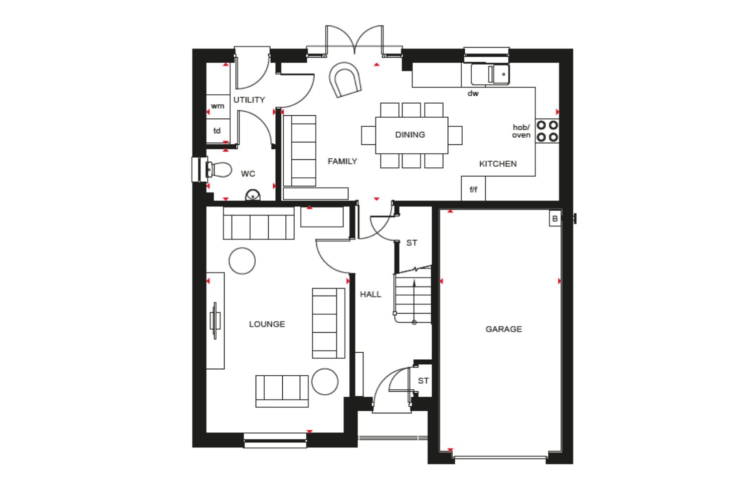 The Ballathie offers you an open-plan kitchen/dining/family area with access to the back garden and a spacious lounge. A utility room, WC and integral garage complete your home.