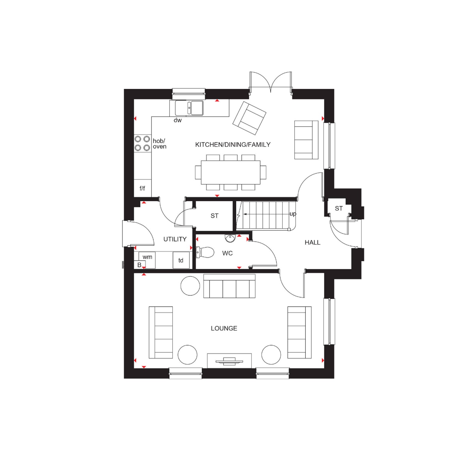The Ballathie offers you an open-plan kitchen/dining/family area with access to the back garden and a spacious lounge. A utility room, WC and integral garage complete your home.