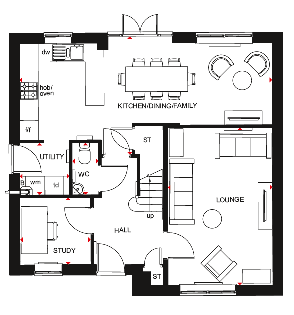 With ENERGY SAVING FEATURES, The Maidstone is an ideal family home. The ground floor has a spacious lounge and an OPEN-PLAN kitchen diner with FRENCH DOORS leading to the SOUTH FACING GARDEN.