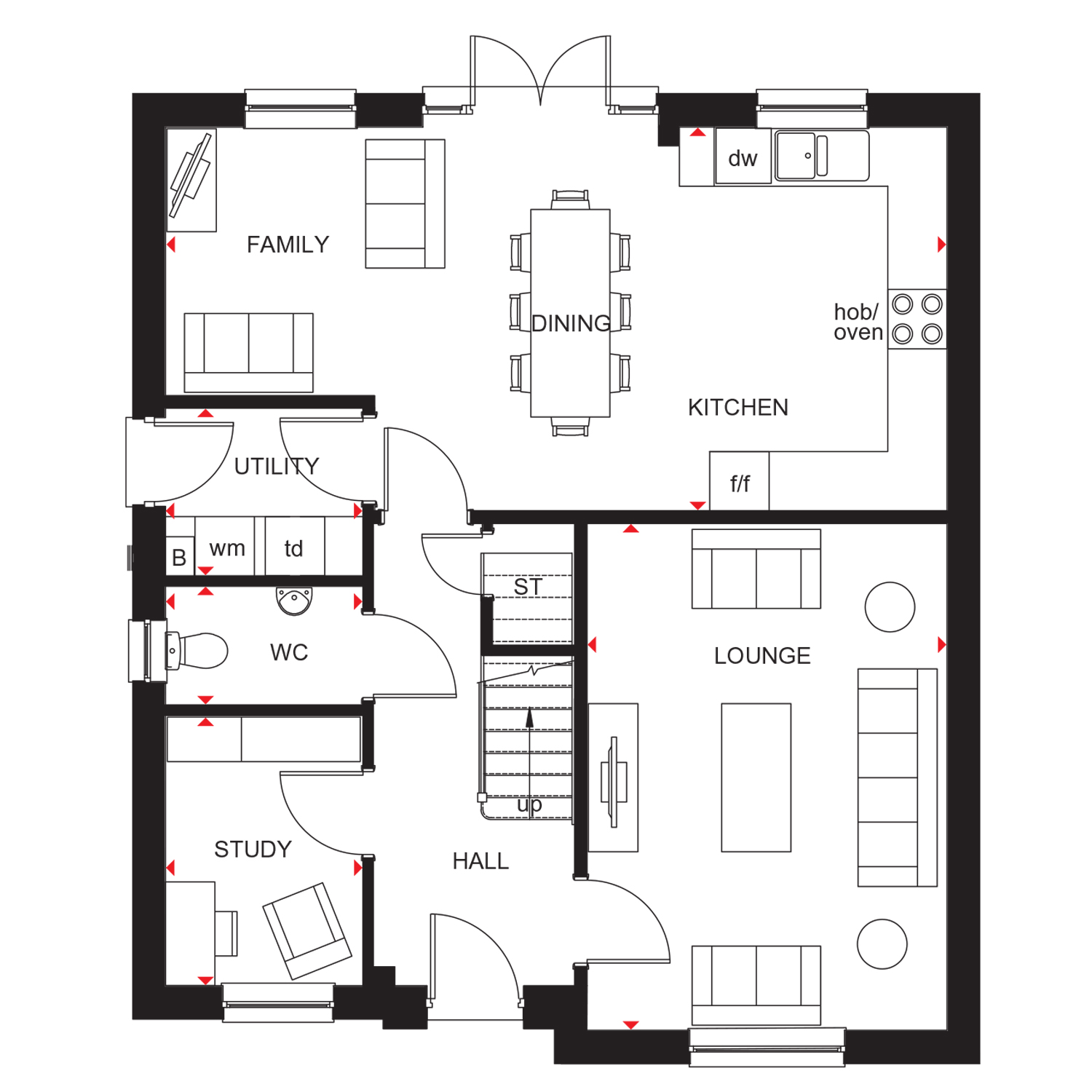 You`ll find plenty of space for the whole family in the Harris. Downstairs, it features a large living room, study and WC along with an open-plan kitchen/dining/family area and utility which both provide access to the garden. Upstairs, there are four double bedrooms, an en suite shower room to bedroom 1 and a family bathroom. Perfectly situated for commuters, there is a new junction onto the M9 providing easy and quick access to both Edinburgh and Glasgow. There are also plenty of local amenities nearby as well as outdoor spaces for walking.