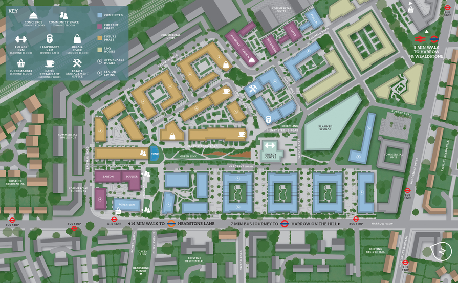 Building on a rich legacy, Eastman Village brings a new life to the former Kodak factory. Offering residents an on-site concierge, gym, Sainsbury`s Local, cafes and over 6 acres of green space, there`s plenty available at Eastman Village. Reach Euston in 12 minutes from nearby Harrow & Wealdstone station, or enjoy the green spaces on offer.ShoppingLove to shop? You'll find plenty of opportunities for some retail therapy close-by, with both St Ann's and St George's shopping centres just a 4-minute drive away. Or if fitness is more your thing, there's a huge range of activities to try at Harrow Leisure Centre, just a 5-minute drive from Eastman Village ' including a high climbing wall, swimming pool and 160+ station gym. And when it comes to eating out, you'll be spoilt for choice with Wealdstone High Street's wide range of restaurants and cafes ' including the family friendly Shobha's Rasoi and popular Meeting Palace ' on your doorstep. TransportOnly 11 miles north-west of Central London and surrounded by excellent transport links, commuting to the city and further afield from Eastman Village couldn't be easier. You'll find a bus to Harrow-on-the-Hill right on your doorstep, Harrow & Wealdstone Overground station just a 10-minute walk away, and London airports under one hour's drive away. Reach Euston in just 12-minutes and Bank in 35-minutes from nearby Harrow & Wealdstone station (Bakerloo line, Overground & West Midlands Trains). LeisureIf you're looking for a fun day out for all the family, head to Headstone Manor and museum ' just a 10-minute walk away from Eastman Village. Set within historic grounds, Harrow Local History Museum celebrates 1200 years of history in Harrow with plenty to do, see and learn. Alternatively, Roxbourne Park is just a 10-minute drive away ' perfect for walkers, families and nature-enthusiasts alike, with football pitches, a children's play area, model steam railway and woodland walk situated within 26 hectares of open space. You can also find Northala Fields a 20-minute drive away; an award-winning country-style park with several fishing lakes, four artificial hills and a large field areaEducationHarrow Primary School & Harrow High School (19-minute bus or 31-minute walk), Harrow school (19-minute bus, 34-minute walk) and Harrow college (13-minute bus or 26-minute walk) are all within a 20-minute bus-ride away from Eastman Village. Sharpe Academy & El Iman Arabic School (21-minute bus or 33-minute walk) is also within walking distance.