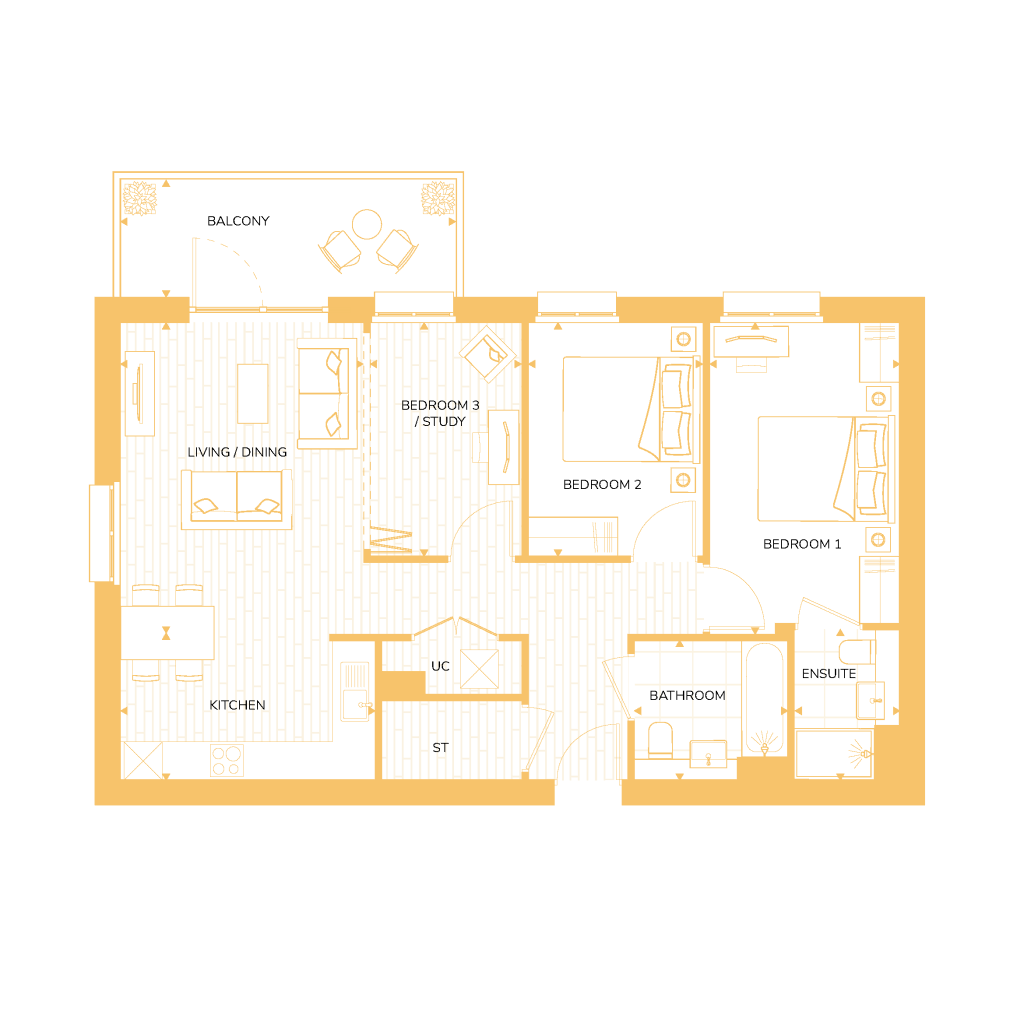 This first floor apartment is ideal for first time buyers. It enjoys a modern, open plan layout, a spacious private balcony that creates a fantastic outdoor extension to your living space and a stylish kitchen includes stone worktops, with integrated AEG appliances. Along with two double bedrooms, the flexible design allows for either a study or third bedroom should you need it. Total area: 808 sq ft (75.10 sq m) Set between Wandsworth and leafy Earlsfield, enjoy hybrid living with quick transport connections to central London, or disconnect in 32 acres of urban wilderness on your doorstep. Your Springfield Village neighbourhood provides a supermarket, gym and caf?for added convenience.