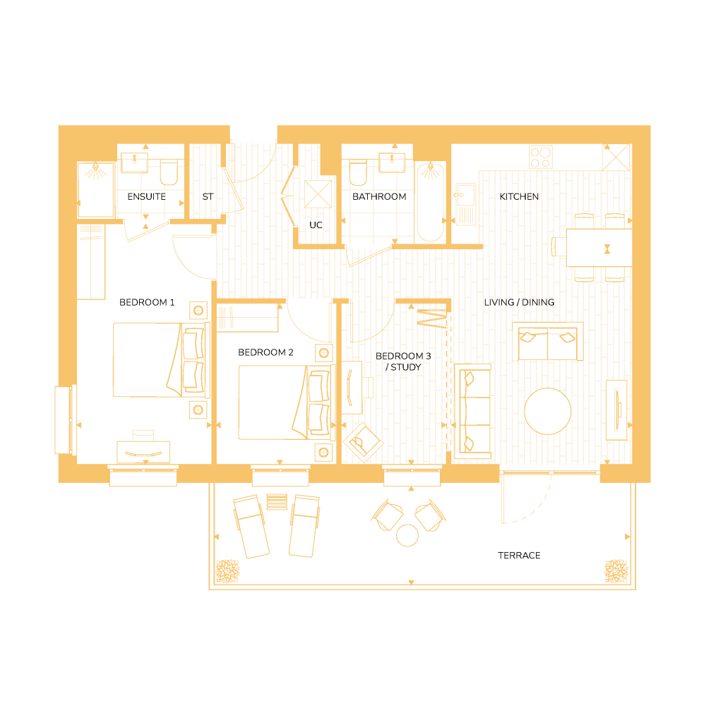 This first floor apartment is ideal for first time buyers. Along with two double bedrooms, the flexible design allows for either a study or third bedroom should you need it.