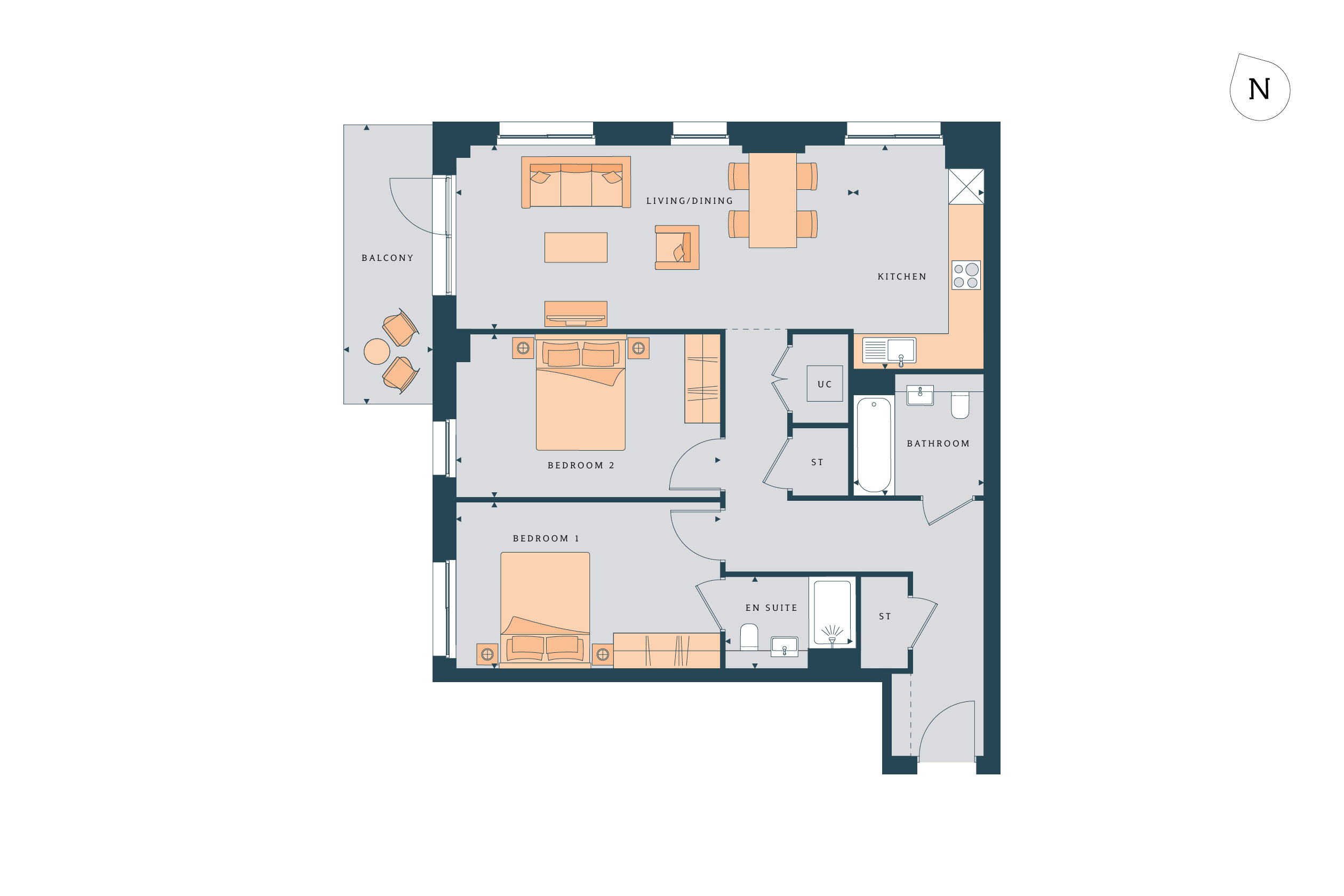 DISCOVER THIS TWO-BEDROOM HOME IS SITUATED ON THE FIRST FLOOR OF BROOKSIDE APARTMENTS. An L-shaped kitchen sits at the heart of this home with an adjoining dual-aspect open-plan living area, boasting plenty of natural light owing to the full-height windows and the west-facing private balcony. There are two double bedrooms, with an en suite to the main bedroom, and a separate family bathroom.