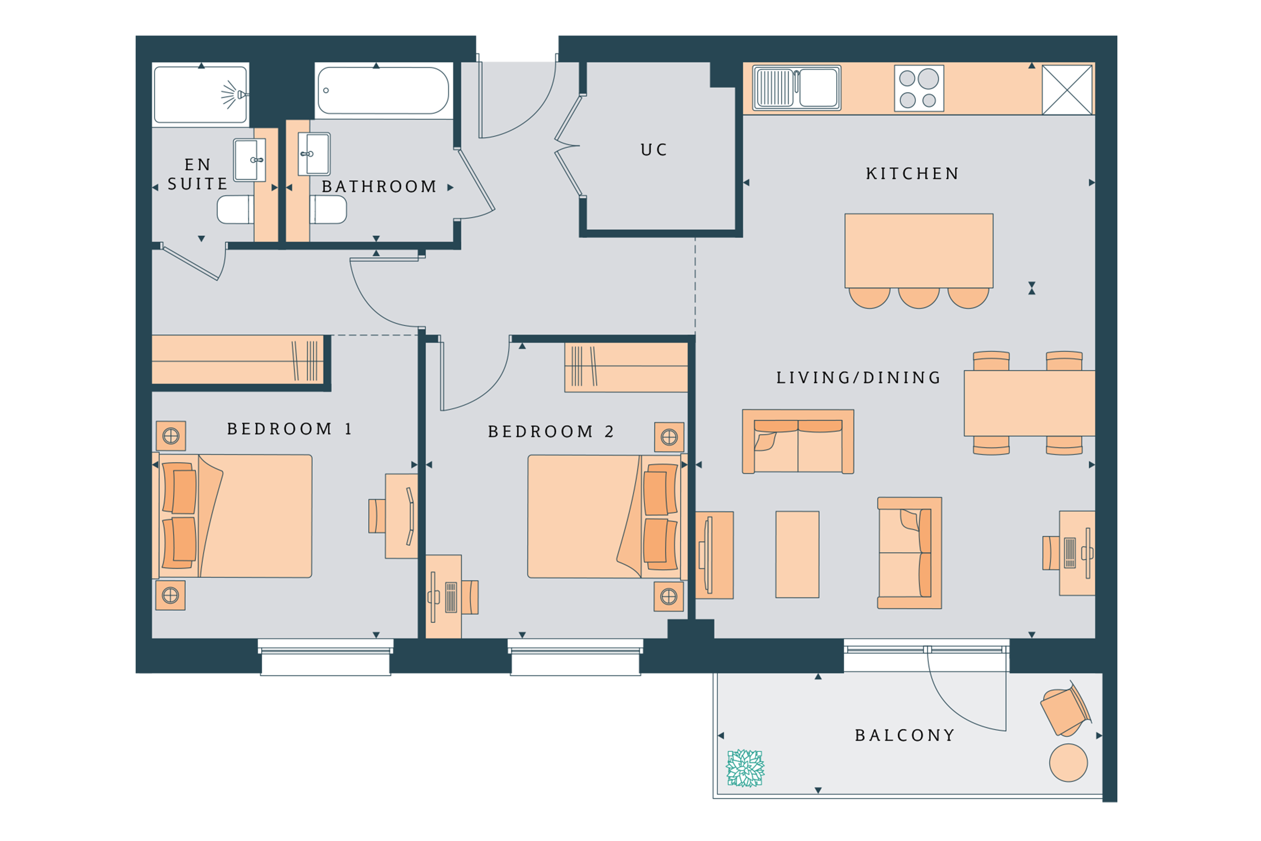 DISCOVER THIS TWO-BEDROOM HOME SITUATED ON THE SEVENTH FLOOR OF WILKINSON APARTMENTS. The open-plan layout seamlessly connects your white, shaker-style kitchen and island unit to the living/dining area and onto a south-facing balcony. There are two spacious double bedrooms, one bathroom, a separate dressing area and an en suite to the main bedroom, and additional storage.