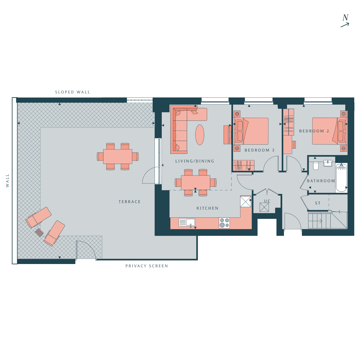 BRAND-NEW RELEASE: DISCOVER THIS THREE-BEDROOM DUPLEX ON THE 10TH AND 11TH FLOORS OF THE WILKINSON PENTHOUSES. Featuring sloped ceilings over 4.7m, a dual-aspect living area opens onto a south-facing terrace, while the statement black kitchen offers stone worktops. The light-filled west-facing bedrooms include fitted wardrobes and the main bedroom has a dressing area, en suite and separate study.