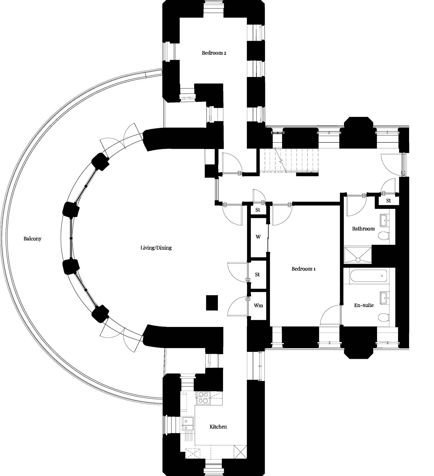 The Skylark is an exceptional duplex home, framed by the iconic curved façade of The Nightingale buildings, offering a spacious double height lounge bathed in natural light and opening onto a private balcony. The bright, modern kitchen flows seamlessly from the living area, while to the rear you’ll find a luxurious main bedroom with en-suite, and a stylish family bathroom. The mezzanine level hosts two further bedrooms, one with a further en suite. Generous storage and built-in wardrobes complete this distinctive apartment, designed for both comfort and individuality.