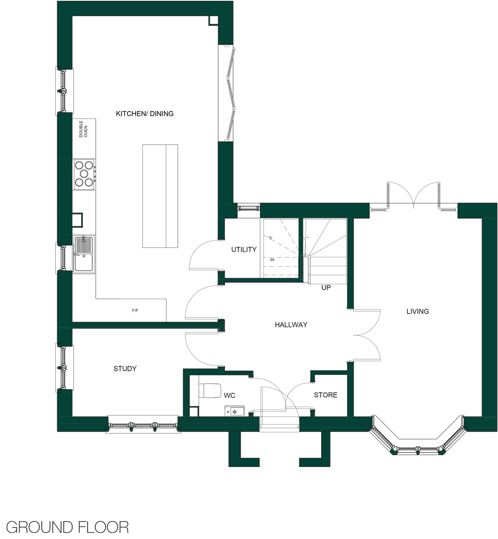 The Kempsford is a beautiful four-bedroom home, uniquely designed for family living. On the ground floor is a conveniently placed WC off the entrance hall, plus a storage cupboard. From the hall you access the spacious living room with a front-facing bay window, plus double doors leading to the rear garden. To the back left of the property, there is a stunning kitchen/dining room with a large island, plus a utility.
