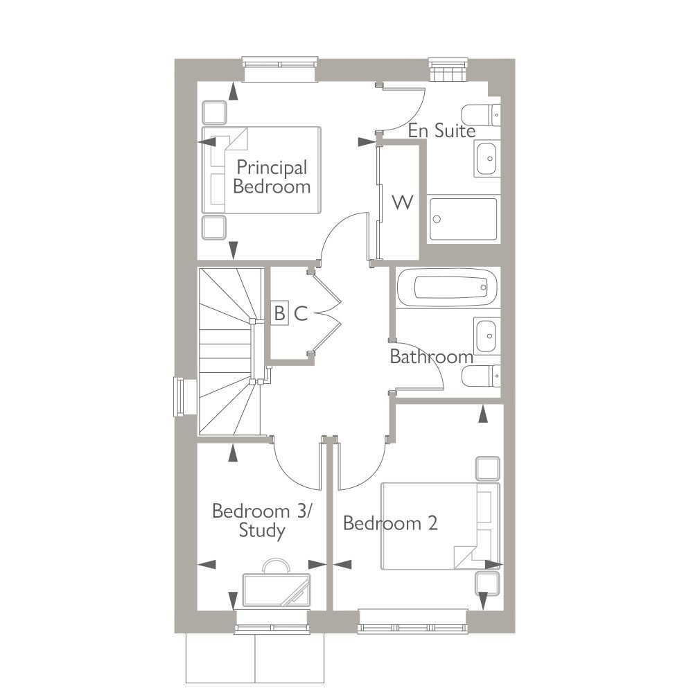 The ground floor features a well-equipped kitchen with integrated appliances, a dining area, and French doors opening to the garden. The spacious living room can be accessed from the kitchen or hallway. Upstairs, two double bedrooms, a study or potential third bedroom, and a family bathroom await. The principal bedroom includes an en suite and fitted wardrobes.