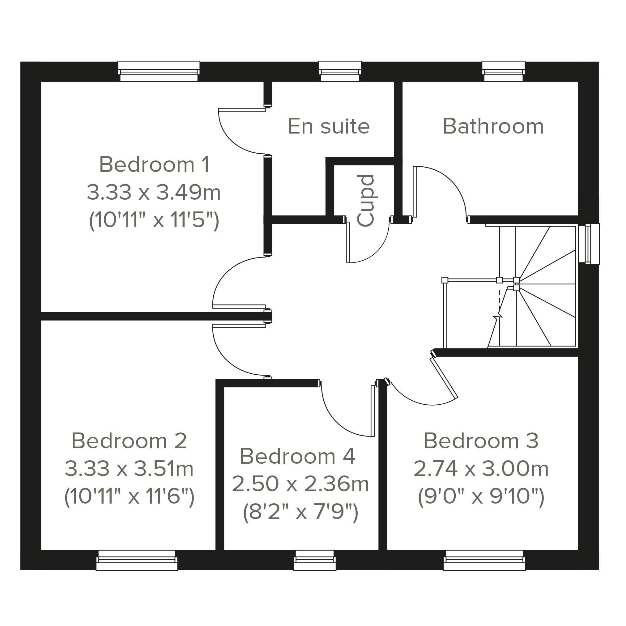 The Leicester is a four-bedroom practical family home. It features an open-plan kitchen/dining room, a light-filled living room with French doors leading into the garden.