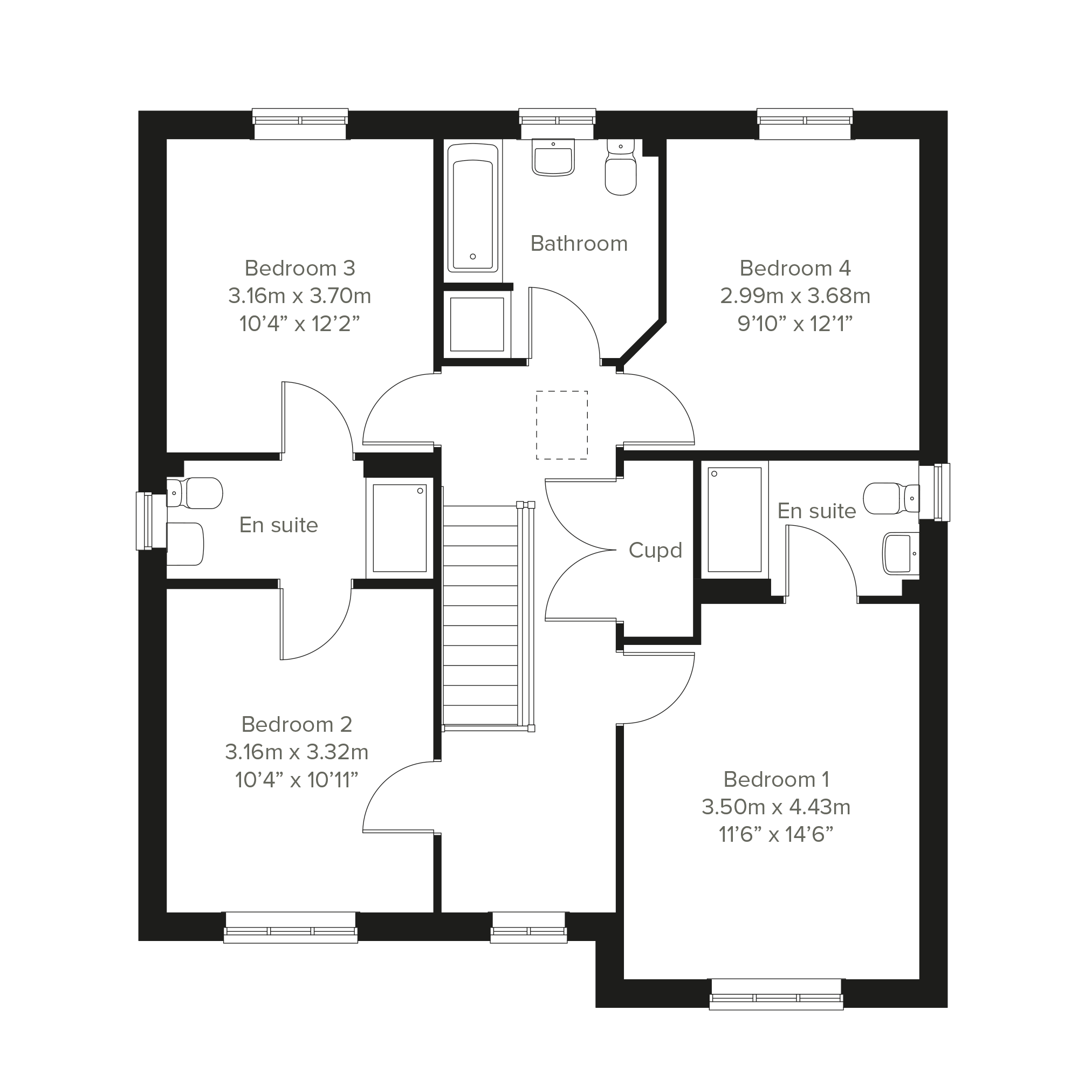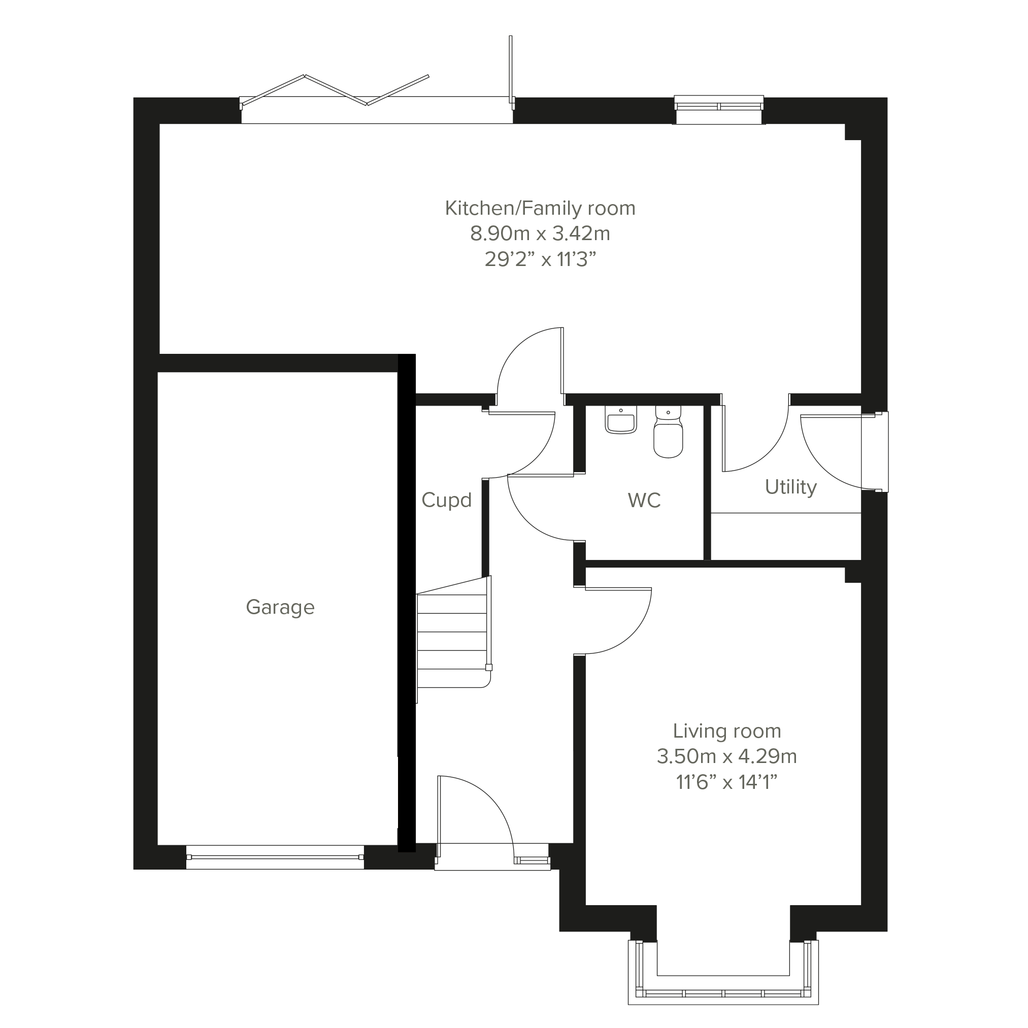 This good-looking four-bedroom, three-bathroom new home has an attractive bay window at the front, and fabulous bi-fold doors leading from the open-plan kitchen/family room to the garden at the back. The integral garage and the utility room (with outside access) are two convenient and practical features that are part of the appeal of the Hollicombe as a family home.