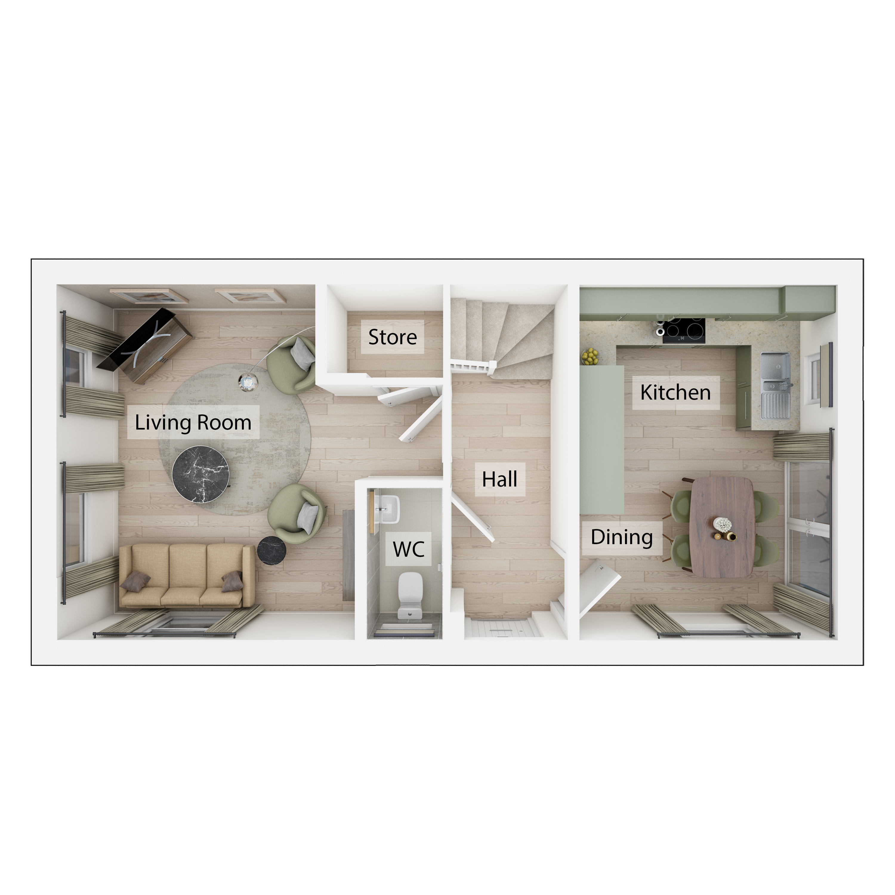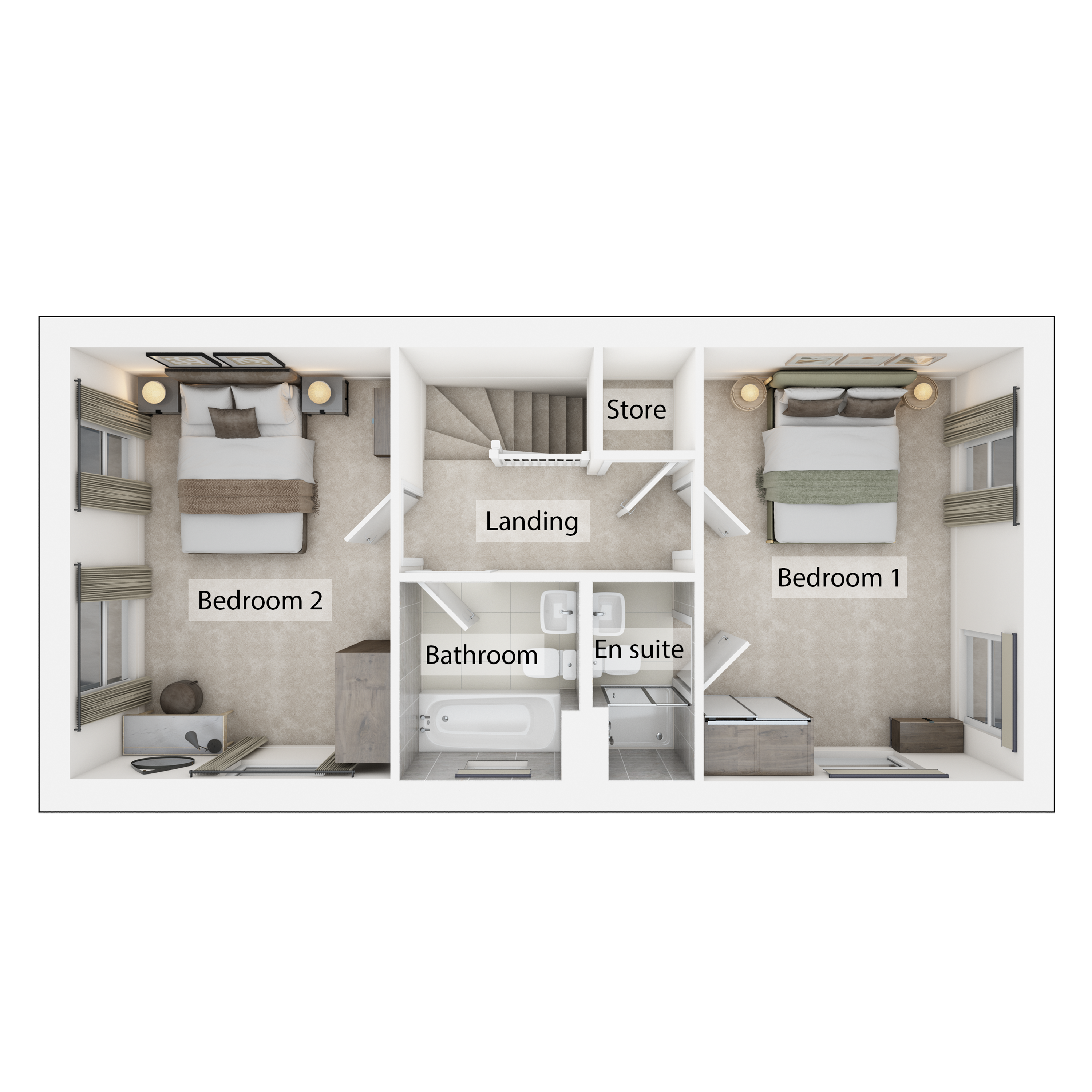 The Nutley is a modern two-bedroom home with an open-plan kitchen/dining room with French doors leading to the garden. Theres a spacious separate living room and a handy WC. Upstairs, bedroom one benefits from an en suite, leading on from the landing is the second bedroom, main bathroom and a handy storage cupboard.