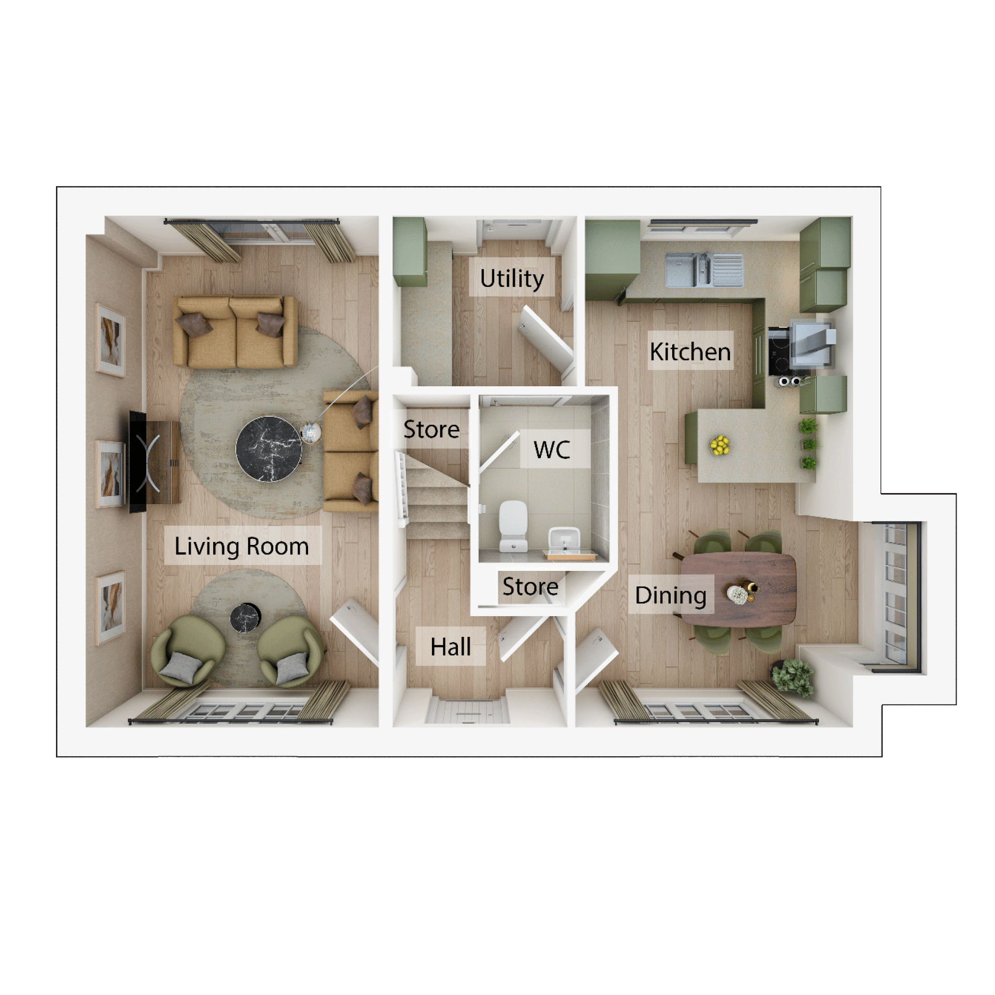 The Moreton is a beautifully designed home. The kitchen/dining room, featuring a charming bay window, is perfect for family meals and entertaining friends. The equally impressive living room has bi-fold doors to the garden. A utility room and WC add everyday convenience. Upstairs, there are three bedrooms including one with an en suite.