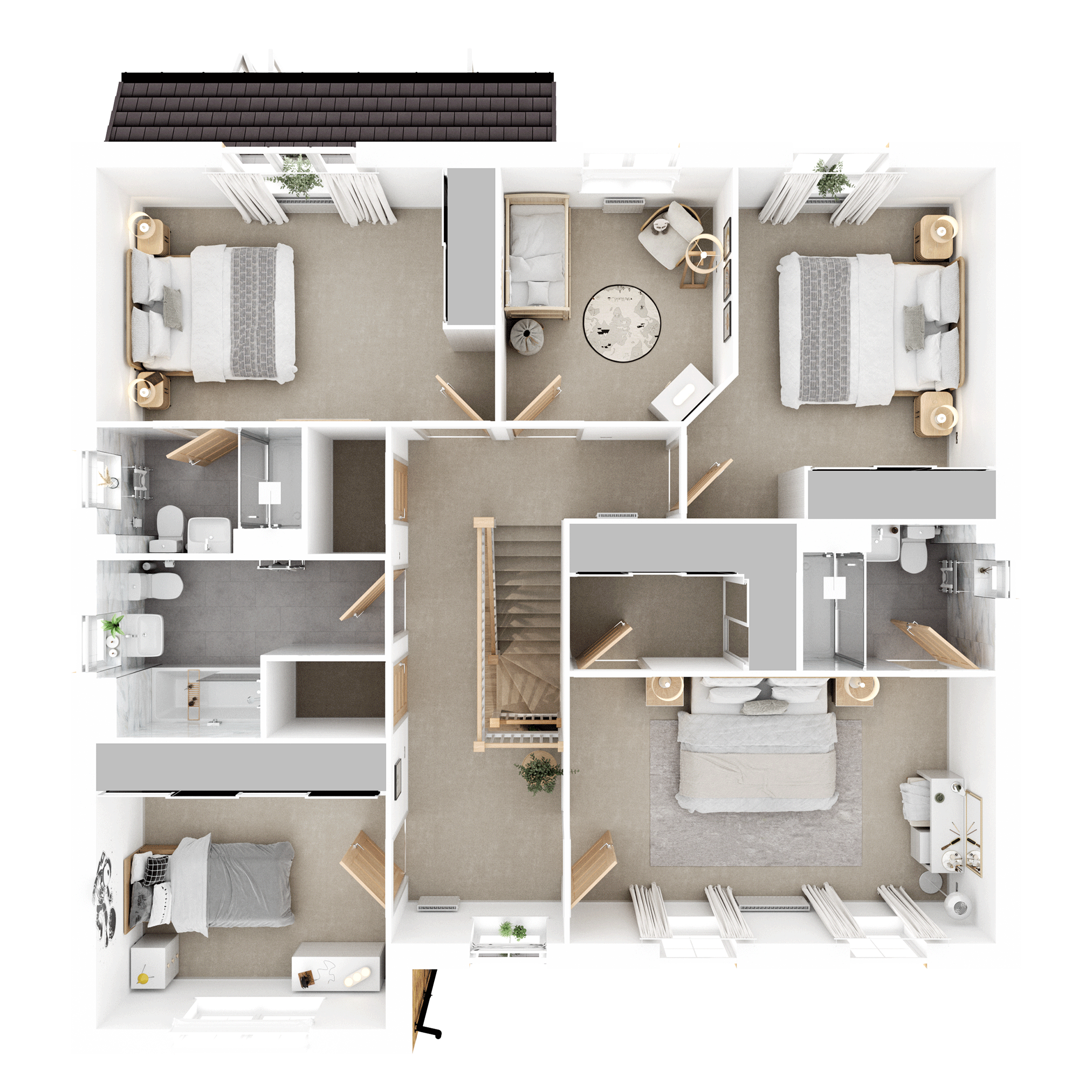 Upstairs, the bedroom 1 has a fitted dressing room and an en suite with a rainfall shower, and Villeroy & Boch sanitaryware. There is also a family bathroom with premium fittings and two en suites, making home life a lot easier.