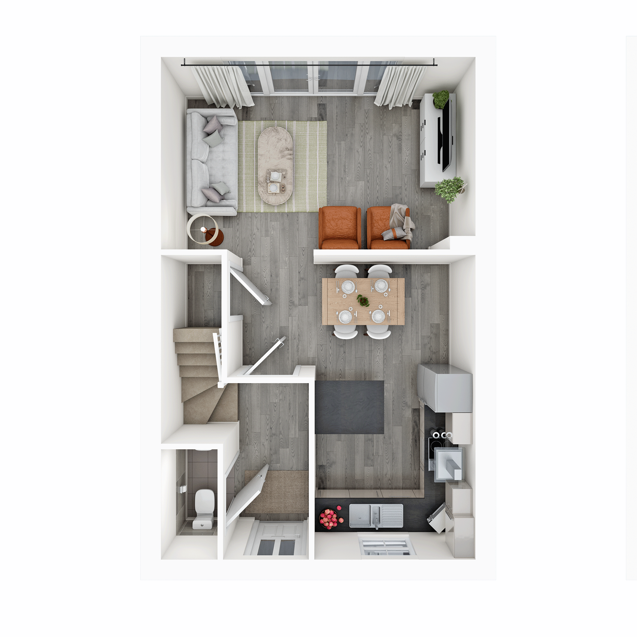 The Brindle is a superb home with a spacious open plan living/dining/kitchen with double doors leading out to the garden- perfect for family life and entertaining. Its practical too, with a downstairs WC and two storage cupboards. There are three bedrooms, the top floor bedroom benefits from an en suite and theres a modern main family bathroom.