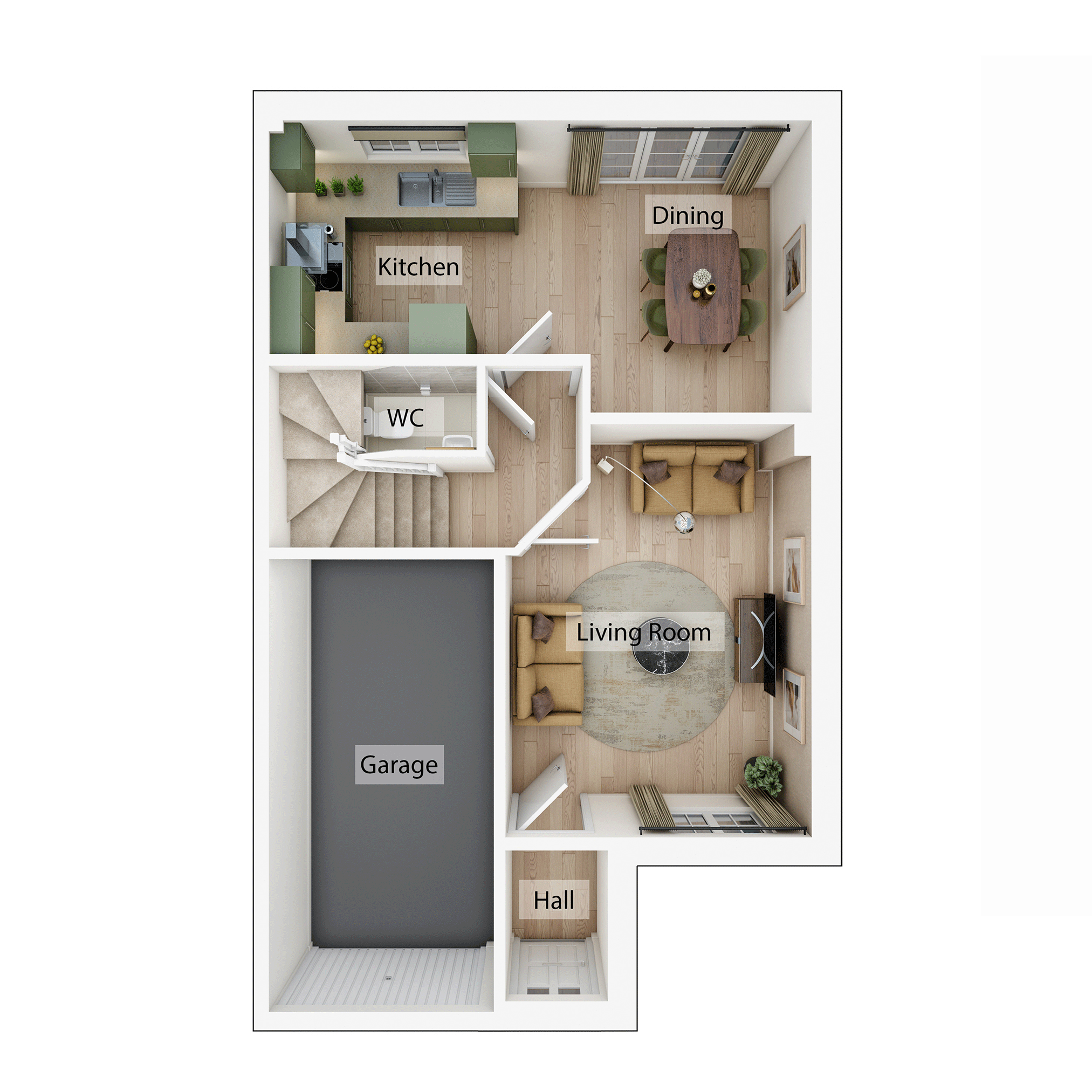The Piccadilly is a popular three-bedroom family home with an integral garage and an open-plan kitchen/dining room with French doors leading to the garden. Theres a separate living room and a handy WC.