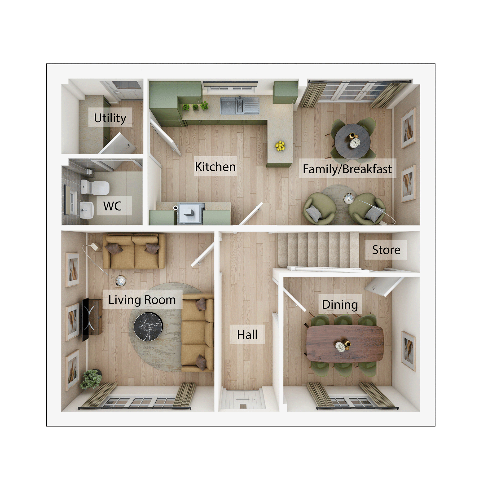 The Whiteleaf is a four-bedroom family home. The kitchen/breakfast room enjoys an open aspect through French doors. There is a living room, a dining room, a WC and utility.