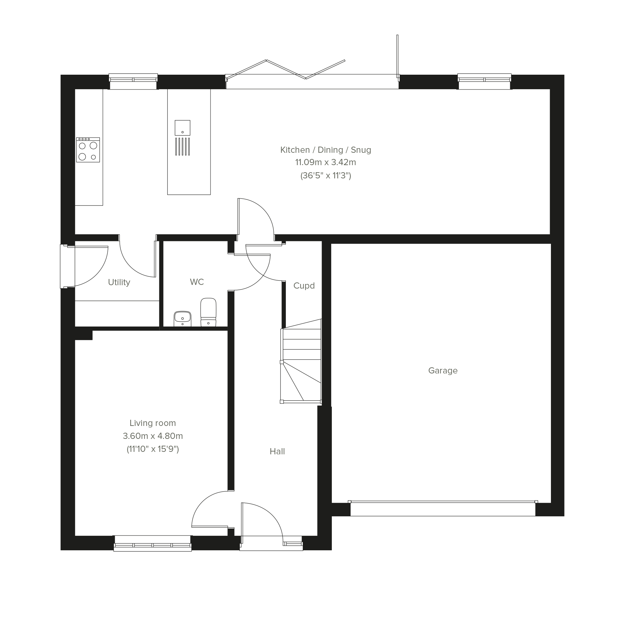 The spacious ground floor of The Walcott is shared between a large open-plan kitchen/dining room/snug or family room with bi-fold doors to the garden, a separate living room and an integral double garage. This is a new detached home thats practical as well as attractive. Five bedrooms allow you the scope to use one as a home office, and three bathrooms are ideal for a growing family.