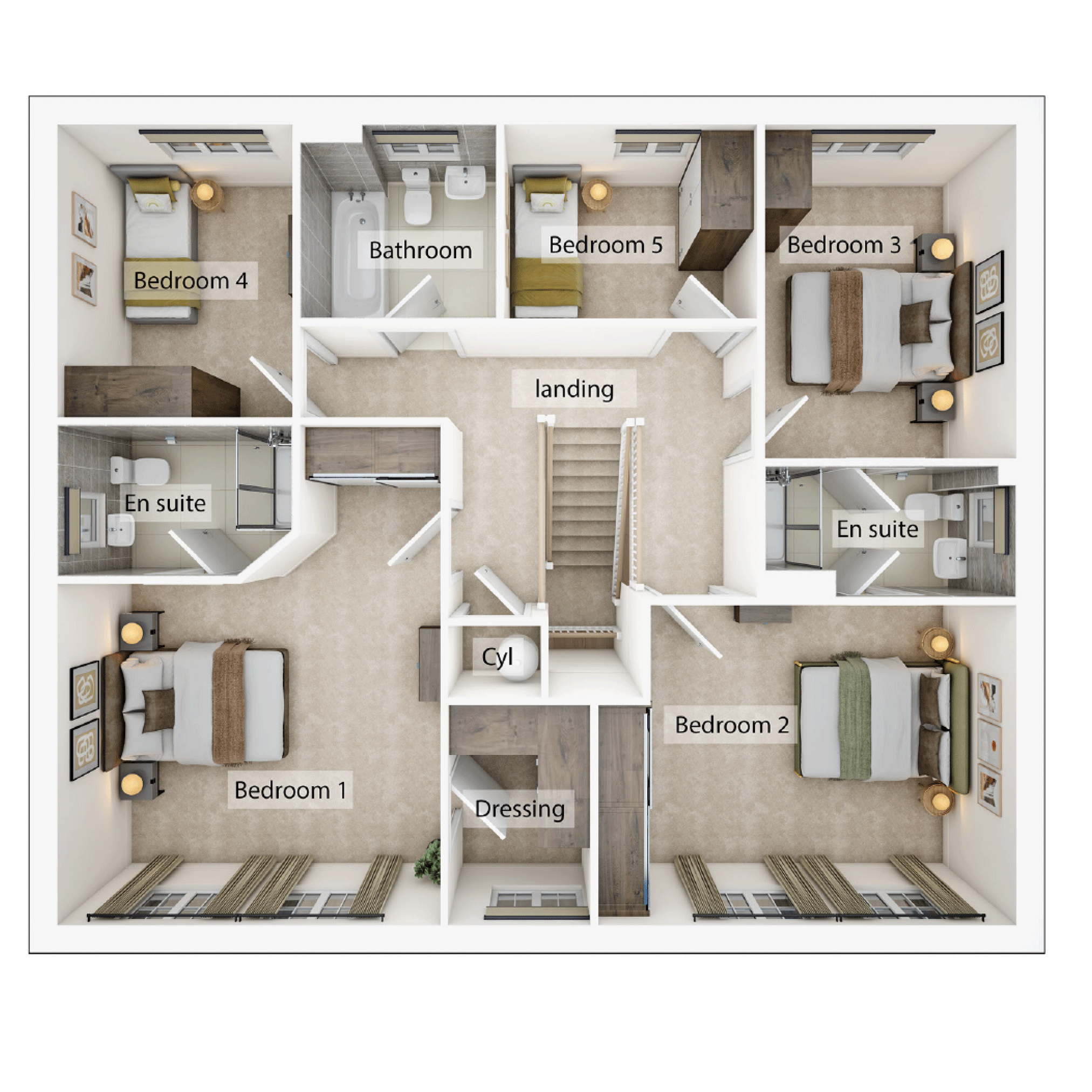 The Portland is a grand five-bedroom, three-bathroom home with an impressive open-plan kitchen/dining/family room with bi-fold doors. Both the dining room and living room are front-aspect. Theres also a utility room with outside access, a downstairs WC and storage space under the stairs. The first floor has five lovely bedrooms, one of which would make a good study. The main bedroom is en suite, bedrooms two and three share a Jack and Jill en suite, and theres a separate family bathroom too.
