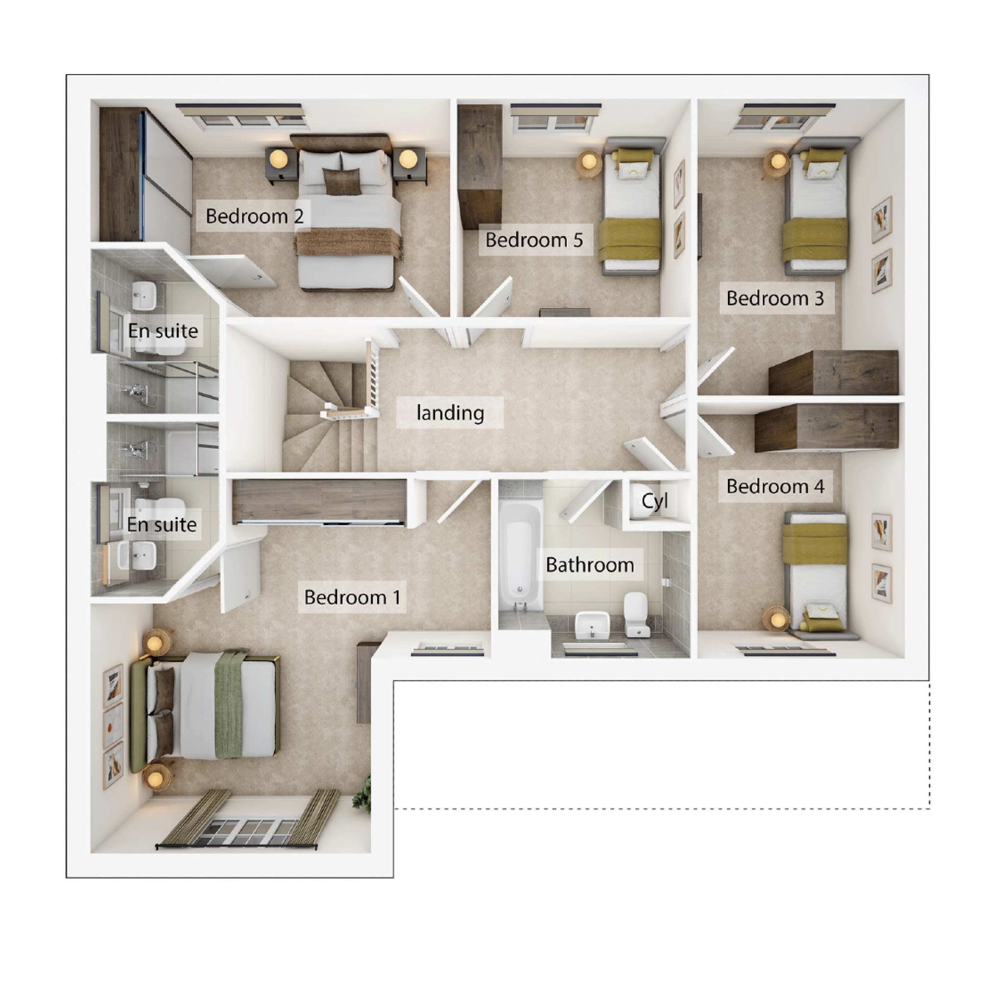 The Fenchurch is a five-bedroom family home with an integral double garage. The open-plan kitchen/dining/family room has bi-fold doors making it a lovely entertaining space for family life. Theres a separate living room, utility room with outside access and a downstairs WC. Upstairs, two of the bedrooms have their own en suites and theres a good-sized family bathroom for the other three bedrooms to use. Storage cupboards on the landing are another convenient detail.