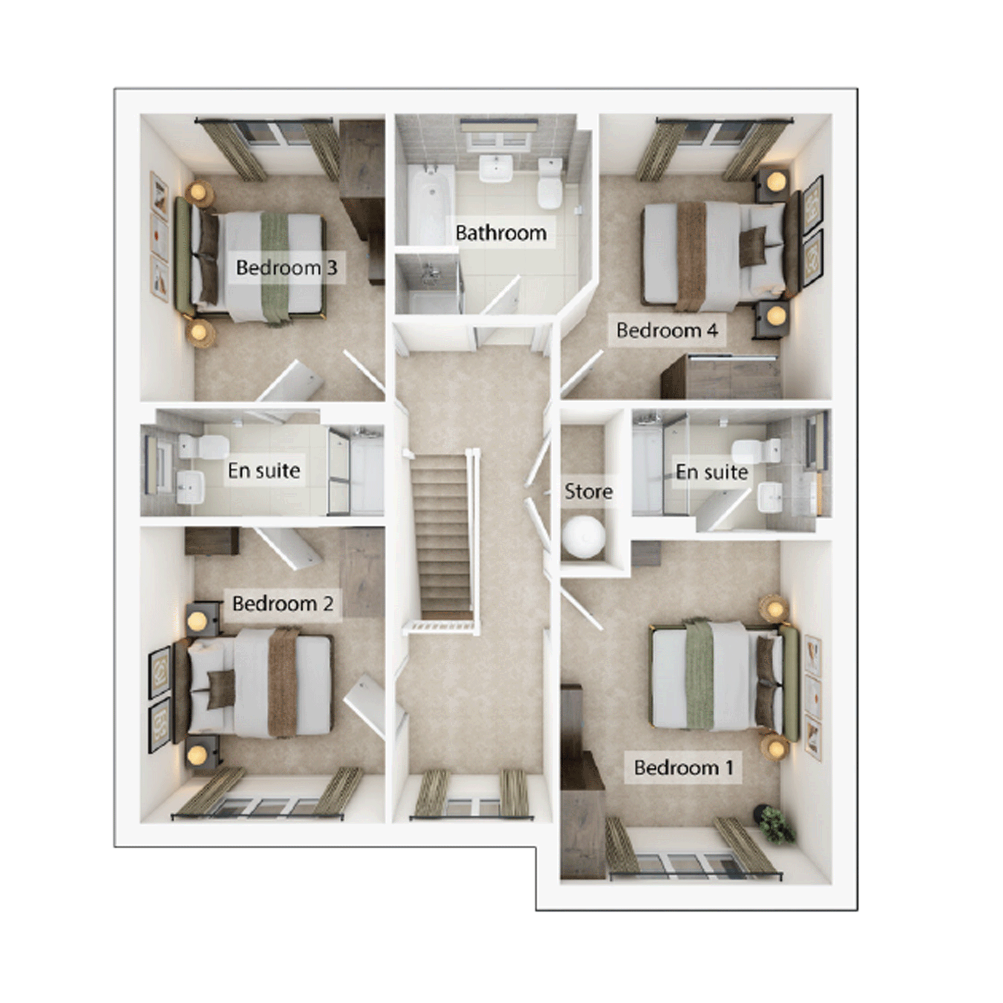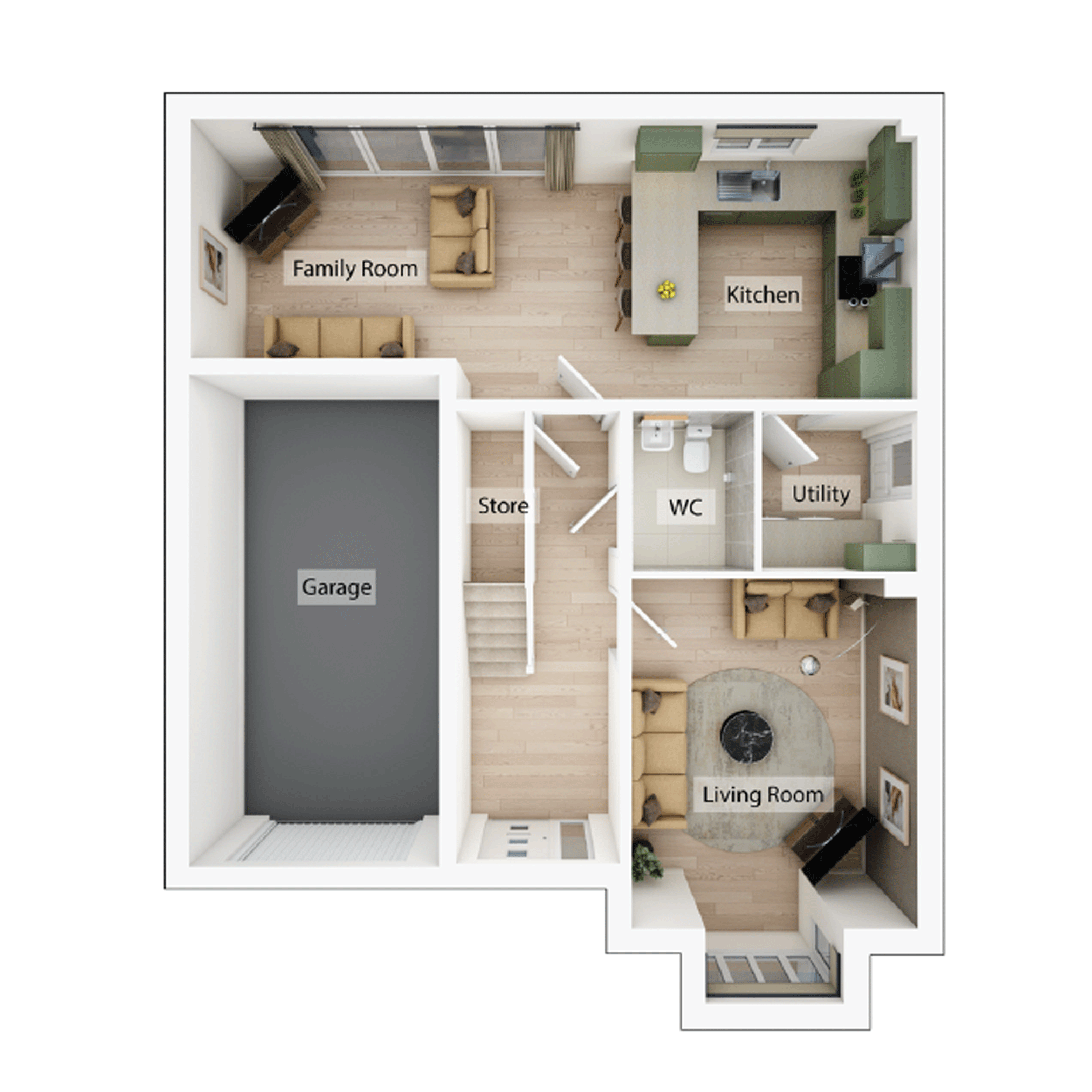 This good-looking four-bedroom, three-bathroom new home has an attractive bay window at the front, and fabulous bi-fold doors leading from the open-plan kitchen/family room to the garden at the back. The utility room has outside access two convenient and practical features that are part of the appeal of the Hollicombe as a family home.