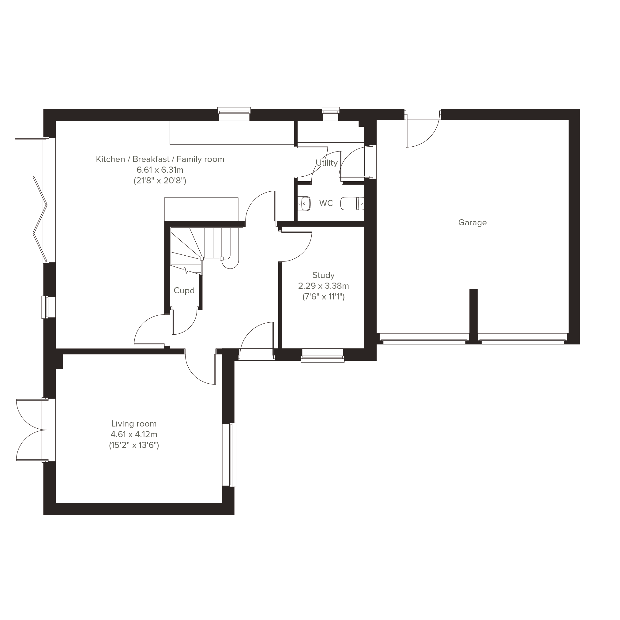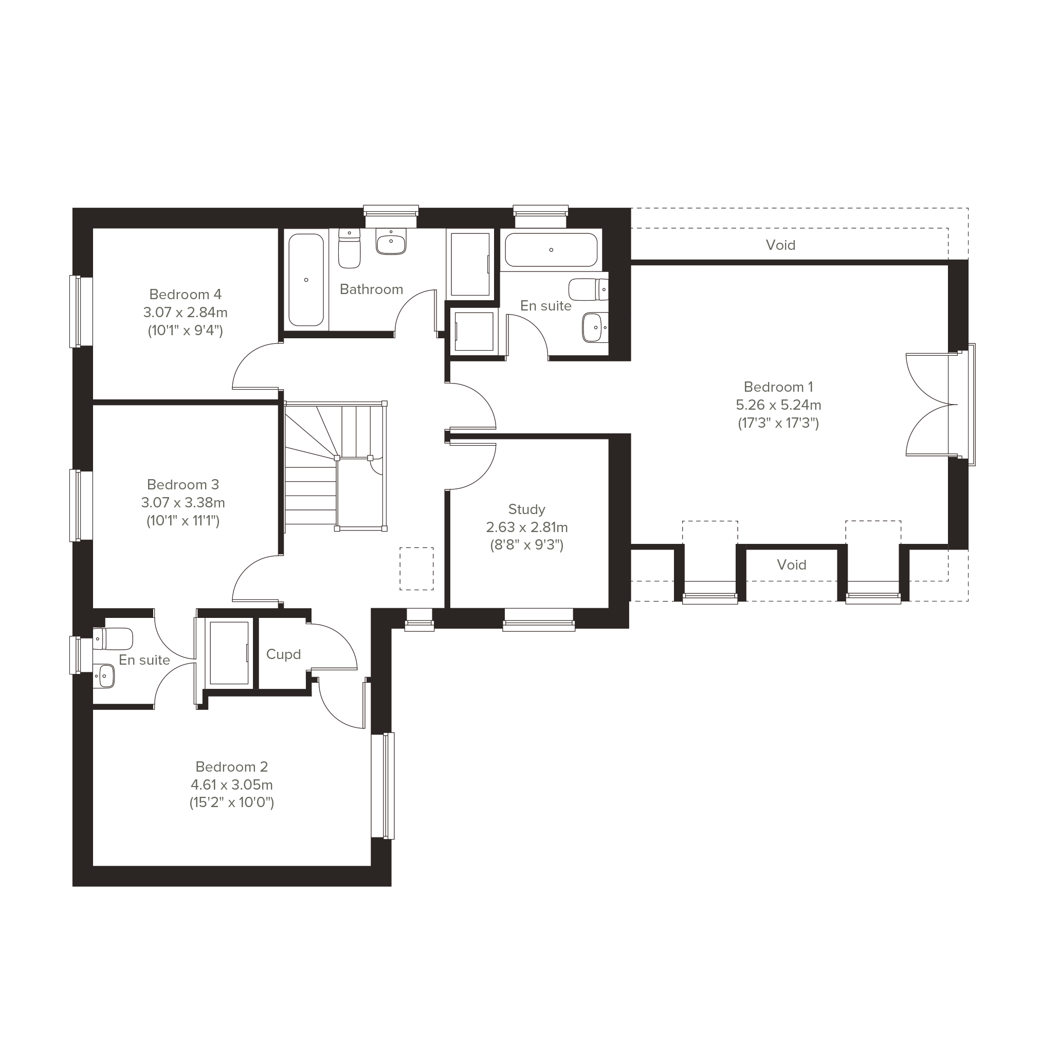 The Oxford is an exceptional five-bedroom detached home that offers space, style and flexibility for growing families. The impressive L-shaped kitchen, dining and family area is filled with natural light thanks to French doors opening to the garden, complemented by a separate living room with its own garden access. A study, utility room and WC add everyday practicality, while the double garage provides ample storage. Upstairs, the luxurious bedroom one includes an en suite, bedrooms two and three share a Jack and Jill bathroom and a further family bathroom serves bedrooms four and five.