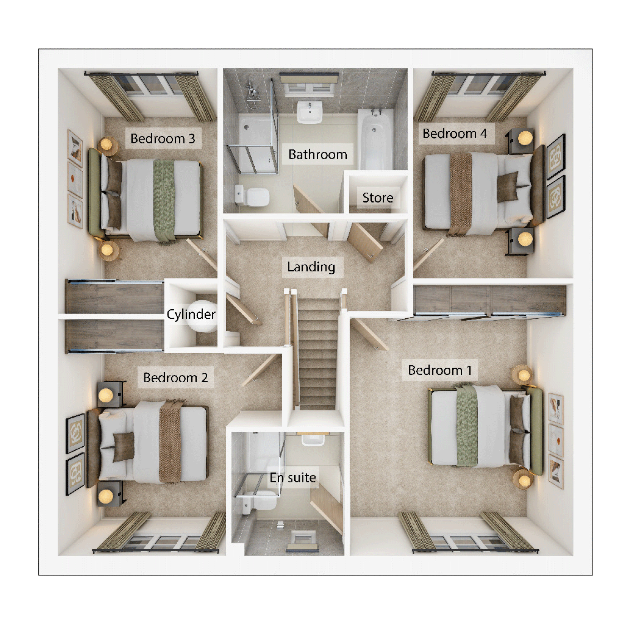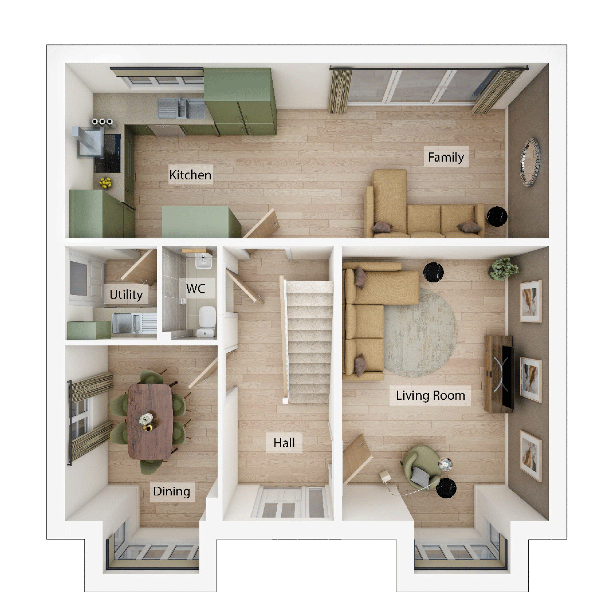 The Sywell is an attractive double-fronted new home with plenty of space for a growing family. Four bedrooms and two bathrooms create a good balance upstairs, while on the ground floor, the living accommodation offers the relaxed open-plan space of a kitchen/family room and the quiet space of a separate living room and dining room. A utility room, bi-fold doors to the garden and a garage are welcome family-friendly features.
