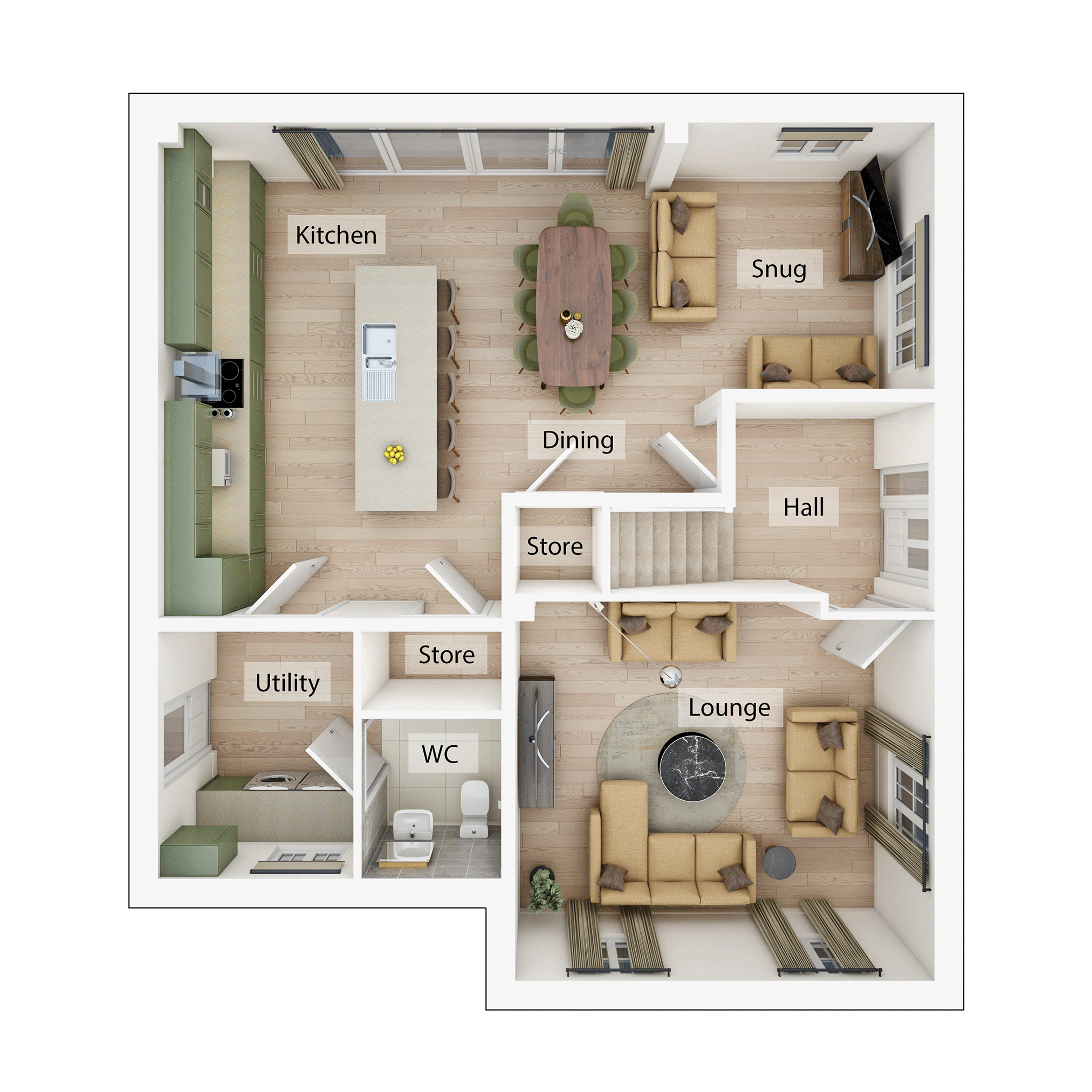 The jewel in the crown of this four-bedroom home is an impressive open plan kitchen/dining room that incorporates a snug, island, and bi-fold doors to the garden. Theres a separate living room, a utility room with outside access, three bathrooms, a dressing room to bedroom one, and a garage. This is a wonderful new home for all aspects of family life.