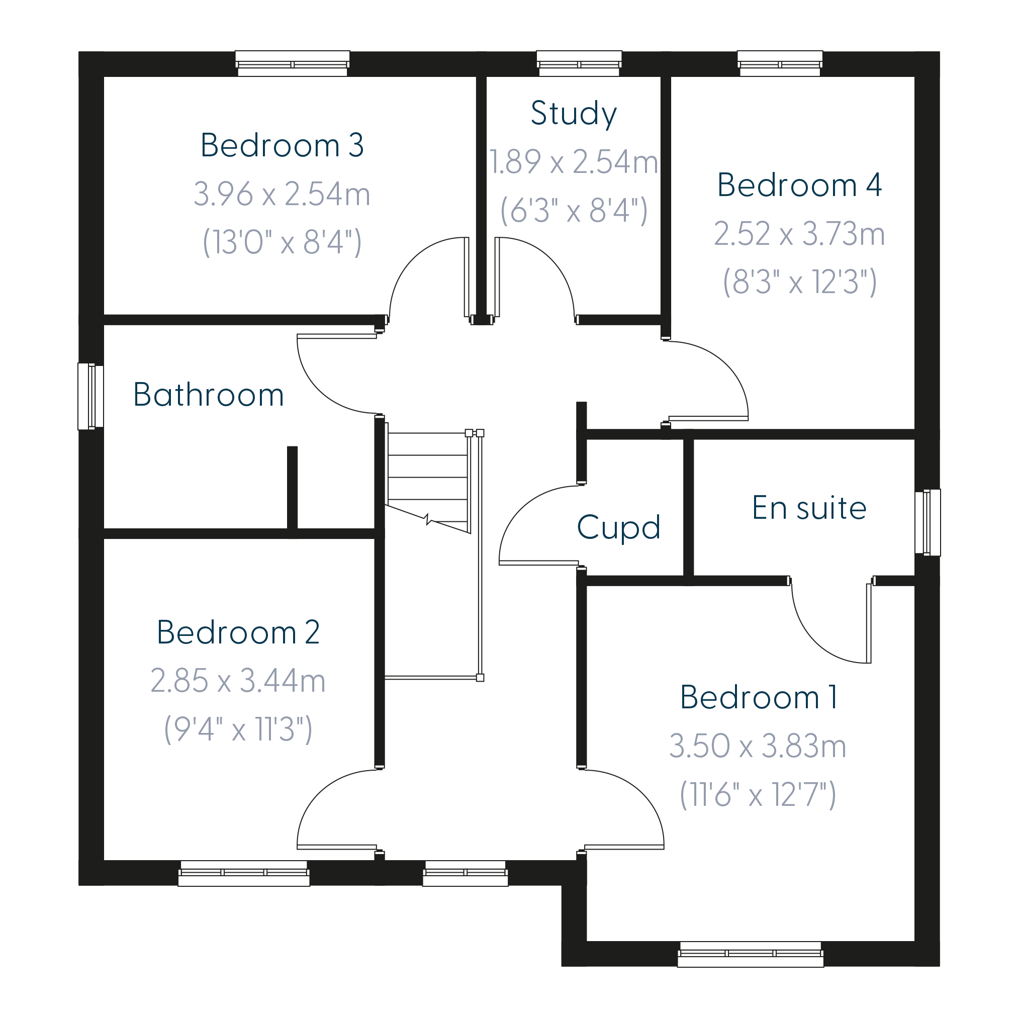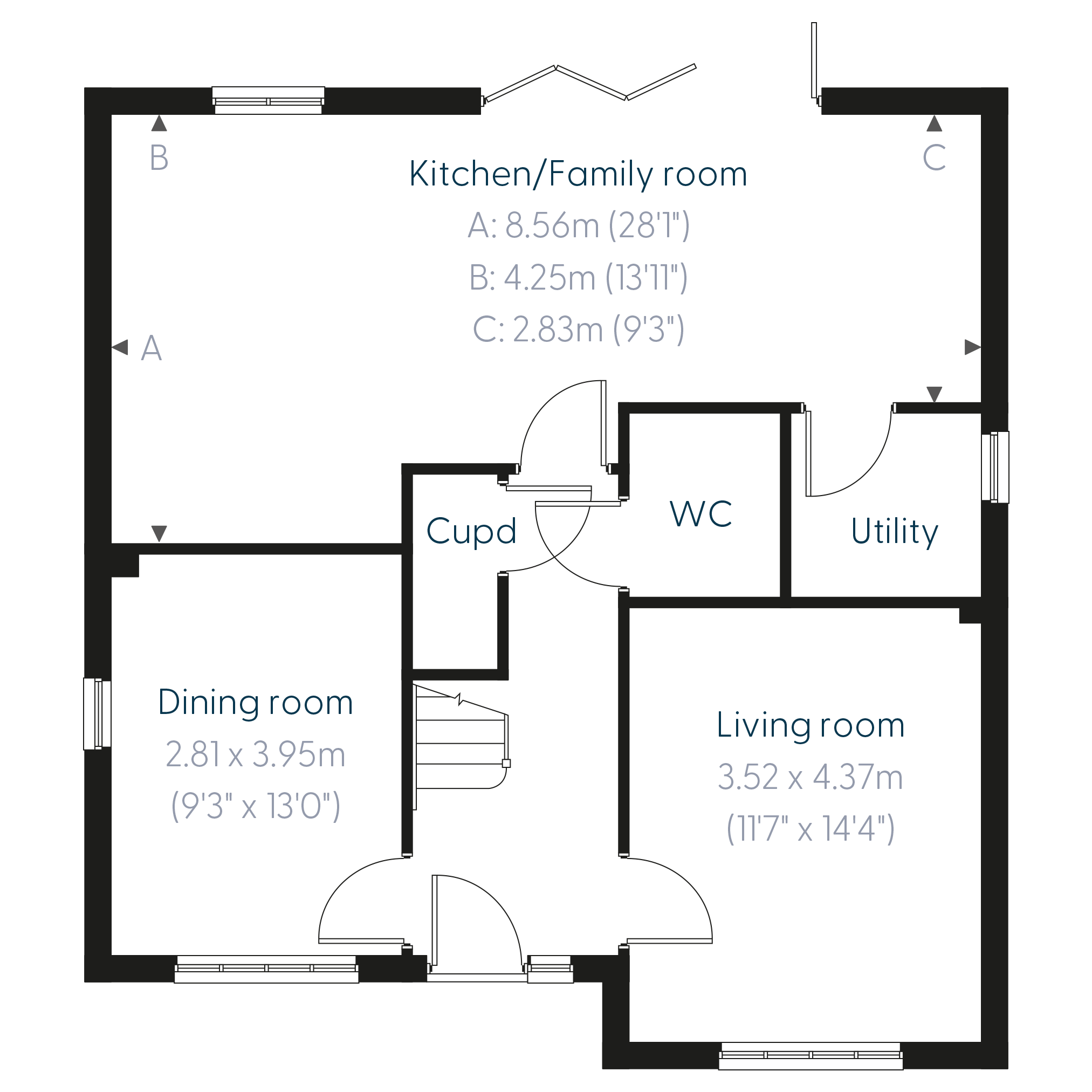 The Lancombe has the contemporary features of an open-plan kitchen/family room and bi-fold doors to the garden, and the traditional features of a separate living room, dining room and cycle/store room. It offers the perfect balance for family life and for entertaining. The first-floor layout includes four bedrooms, a bathroom, en suite and a study.