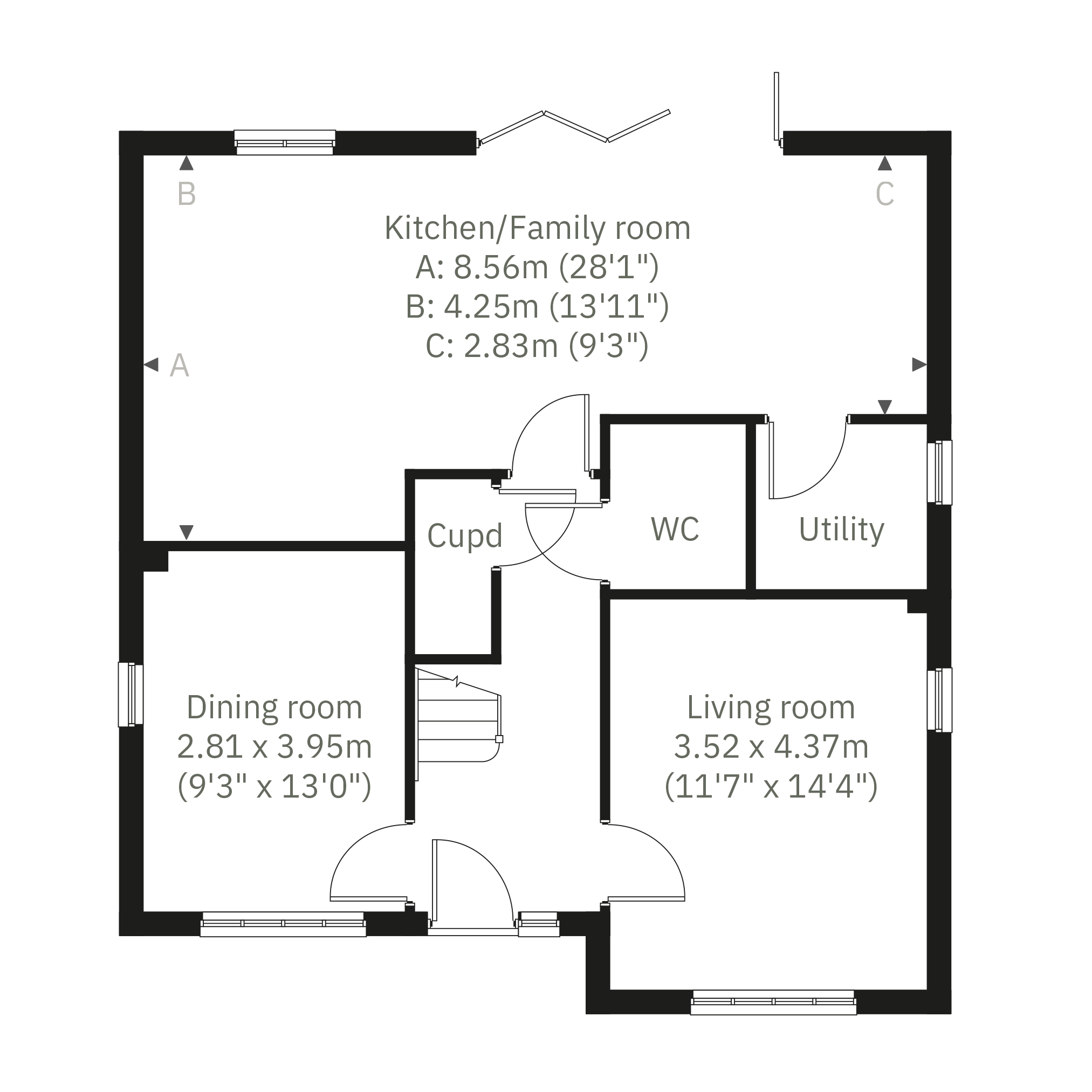 The Lancombe has the contemporary features of an open-plan kitchen/family room and bi-fold doors to the garden, and the traditional features of a separate living room, dining room and garage. It offers the perfect balance for family life and for entertaining. The first-floor layout includes four bedrooms, a bathroom, en suite and a study.