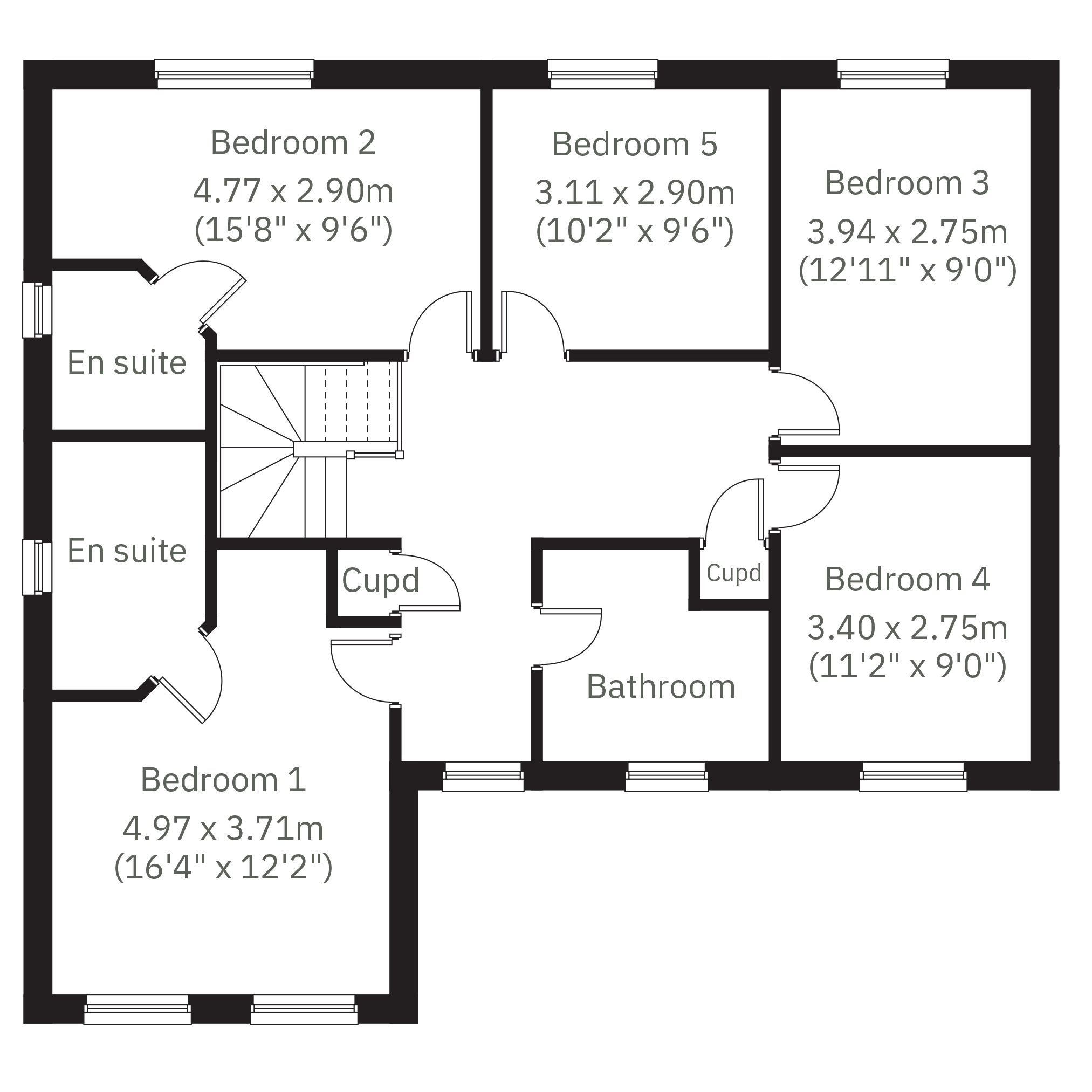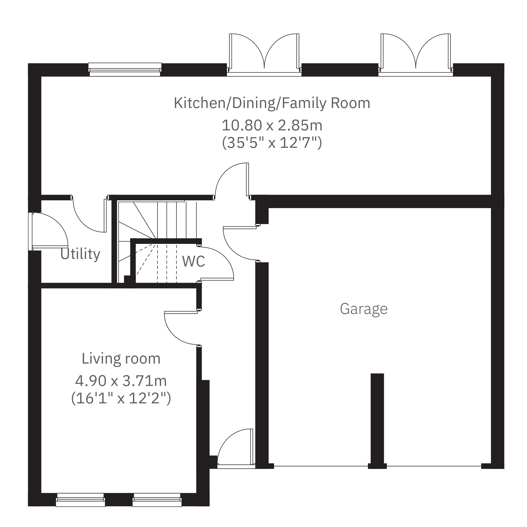 The Fenchurch is a beautiful five-bedroom home with an open plan kitchen/dining/family room with double French doors leading into the rear garden. Plus, theres a spacious front-aspect living room, a separate utility with outside access and an integral double garage. Upstairs, there are five bedrooms and both bedroom one and bedroom two have en suites.