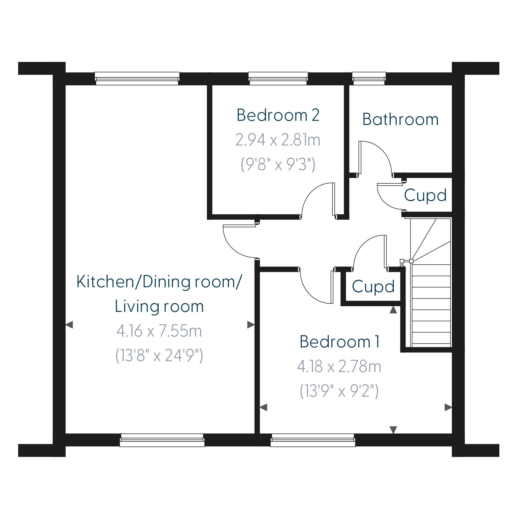 The two-bedroom Cromer has a modern open plan kitchen/dining room rear-aspect living room with French doors to the garden. A handy downstairs WC and great storage complete the ground floor.