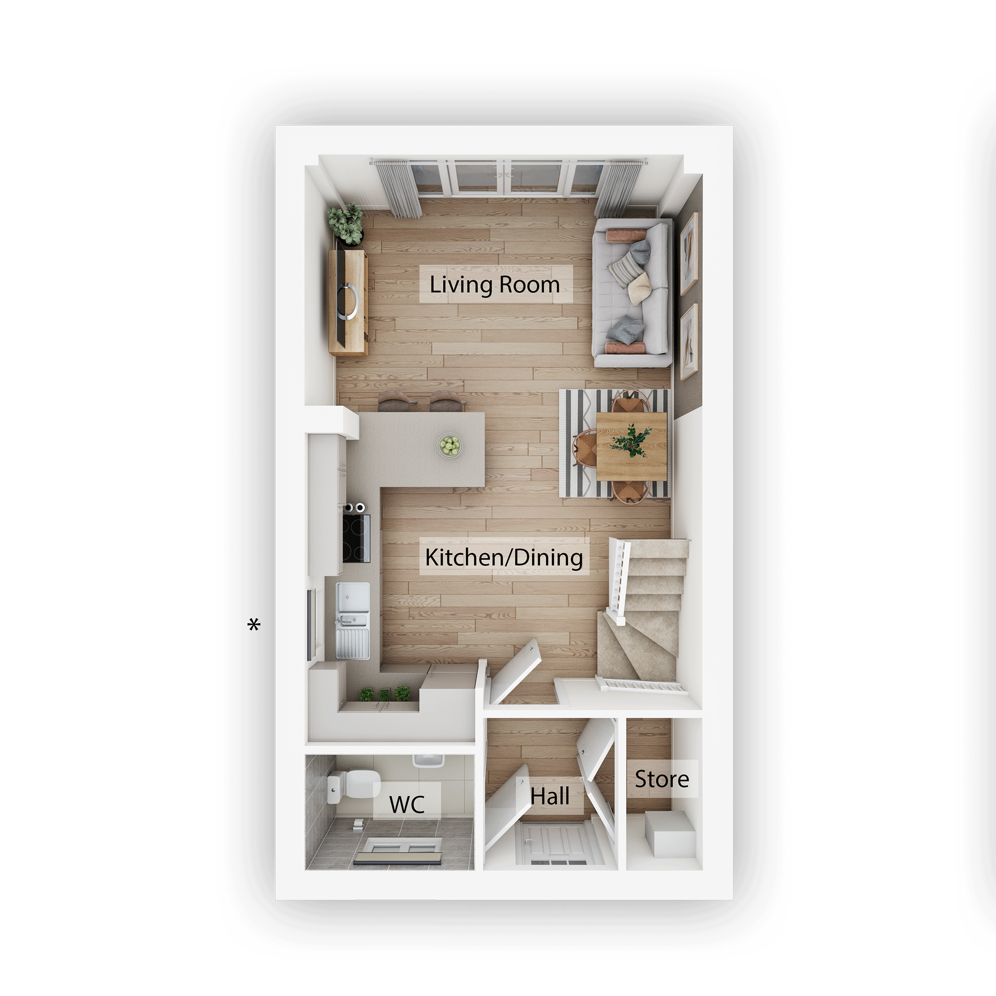 The two-bedroom Cromer has a modern open plan kitchen/dining room rear-aspect living room with French doors to the garden. A handy downstairs WC and great storage complete the ground floor.