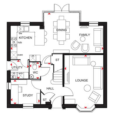 View The Bradgate Show Home at Kings Park - The ground floor offers open-plan kitchen/diner with a glazed bay overlooking your garden. There`s a spacious lounge along with a study, utility room and cloakroom. Upstairs you will find 4 double bedrooms, with the main featuring an en suite, and a stylish family bathroom.