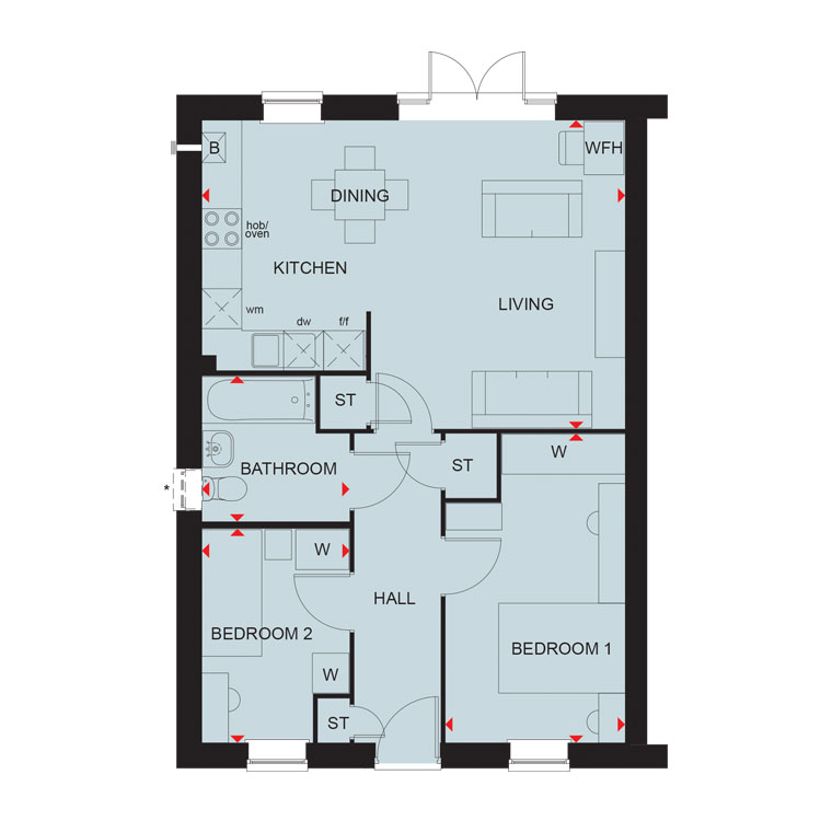 With a contemporary open plan design, The Burleigh is a stylish, energy efficient BUNGALOW. The conveniently laid out living space flows into the DINING AREA and the KITCHEN. The room enjoys natural light through the FRENCH DOORS. There is a DOUBLE BEDROOM with EN SUITE which offers room to relax in. The ADDITIONAL BEDROOM would make a great guest room or home office. There is a DRIVEWAY with PARKING FOR 2 CARS. Plot 136, The ENERGY-EFFICIENT Burleigh, David Wilson Homes at Queens Manor