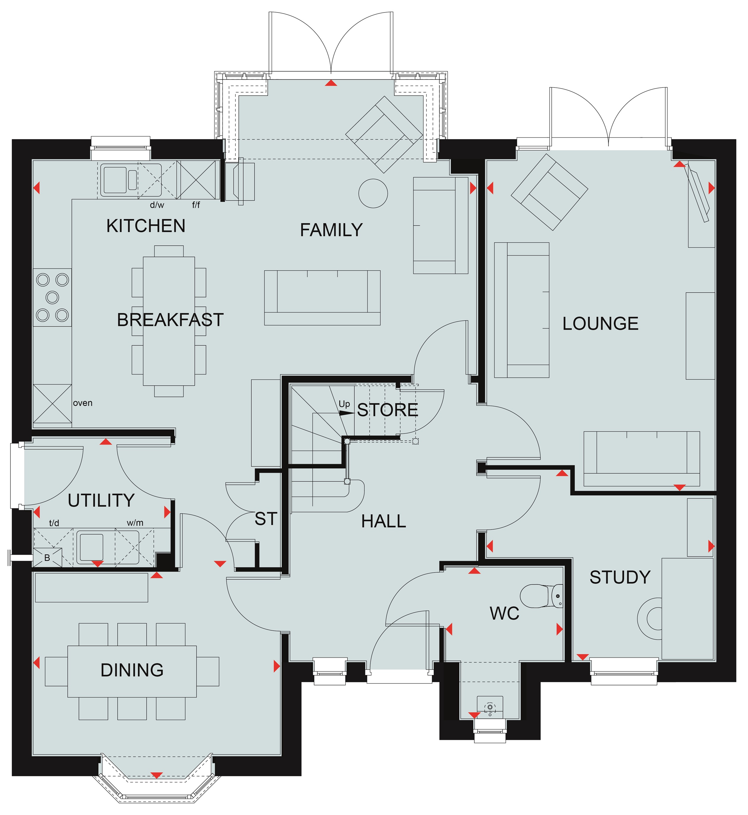 The Manning - This large five bedroom home has plenty of space. Downstairs you will find a modern open-plan kitchen with a glazed pod and French doors to the garden. Benefit from a handy utility room. There`s also a lounge with French doors, a separate bay-fronted dining room and a study. Upstairs you will find four double bedrooms, two with en suites, a single bedroom and a family bathroom.