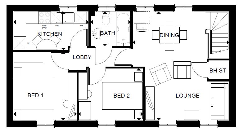 BRAND NEW HOME. The Wincham - A detached 2 double bedroom coach-house. Featuring an open-plan lounge and dining area. Along the hallway are two double bedrooms, a bathroom and a modern kitchen at the end. This home features a garage under the home and a parking space.