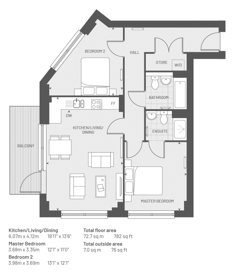 Introducing The Pine - A 767 sq ft two-bedroom apartment on the seventh floor at Southall Grove. Amtico Spacia Sun Bleached Oak flooring runs throughout the living space and has lots of natural light.
