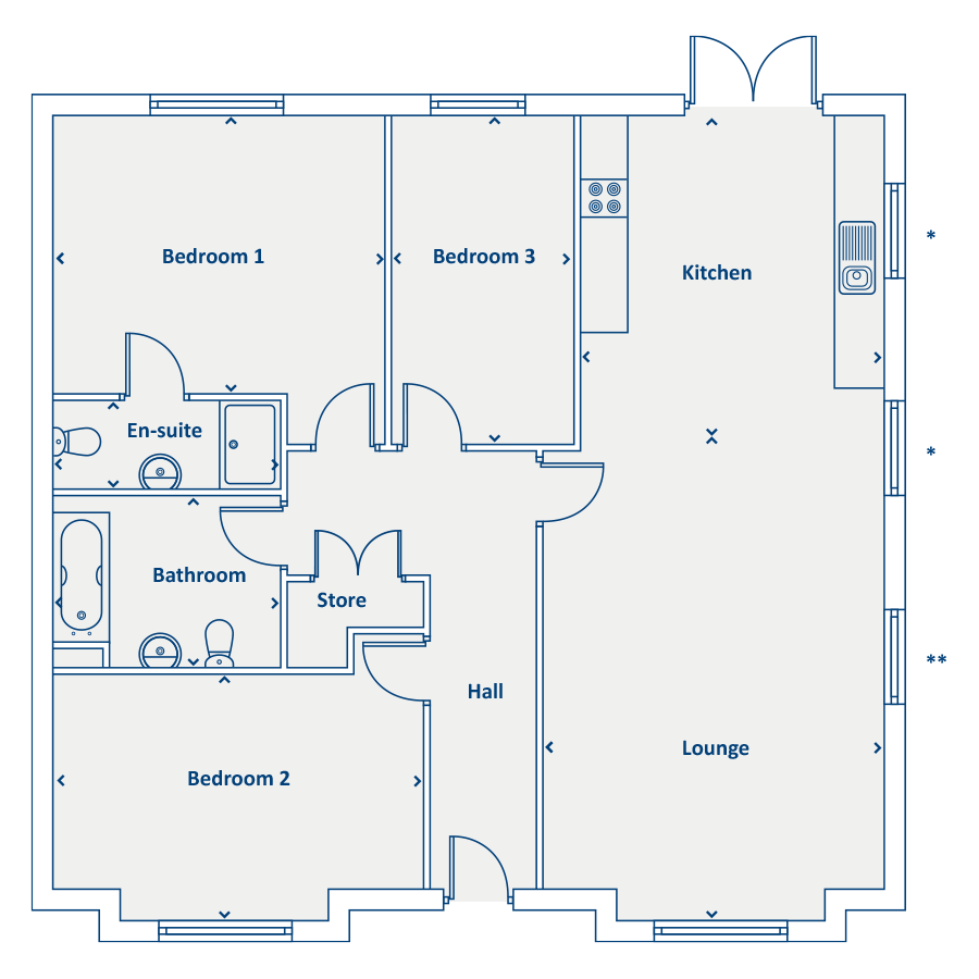The Hazel is a stylish, well-planned three bedroom bungalow offering contemporary living for modern families.At the heart of this home is the light and spacious open-plan kitchen and lounge located at the rear. With French doors opening to the garden, the lounge is flooded with natural light. When the weather permits, simply open the doors to seamlessly connect indoor and outdoor living spaces.Down the hall you'll find three comfortable bedrooms. The master suite features an en-suite bathroom for added convenience. The two remaining bedrooms share access to the contemporary family bathroom. Nearby is a handy storage room, providing space to keep your home tidy.With its abundance of natural light, open-plan living, and three well-appointed bedrooms, The Hazel bungalow offers relaxed contemporary living in a comfortable and stylish package. Tenure: Freehold. Council tax: To be released by the local authority. Estate management fee: 327.47 per annum.