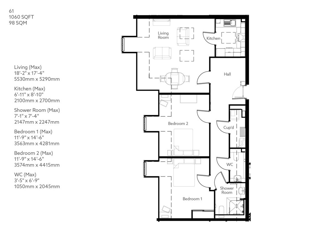 Property 61 is a beautiful two-bedroom apartment measuring 1060 square feet, located on the third floor with an East facing aspect.