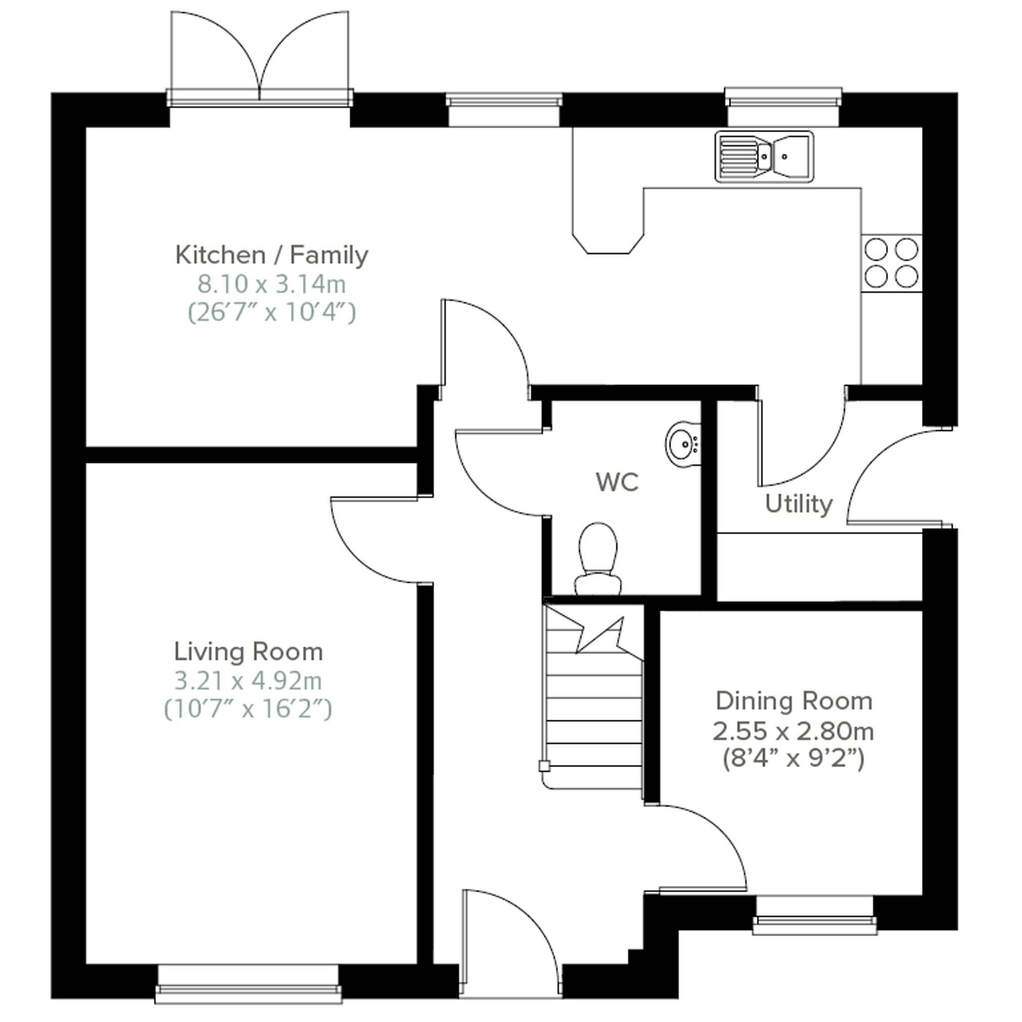 The Greenwood is a four-bedroom, three-bathroom home. The ground floor includes a kitchen/dining room, living room, utility, WC and storage cupboard.