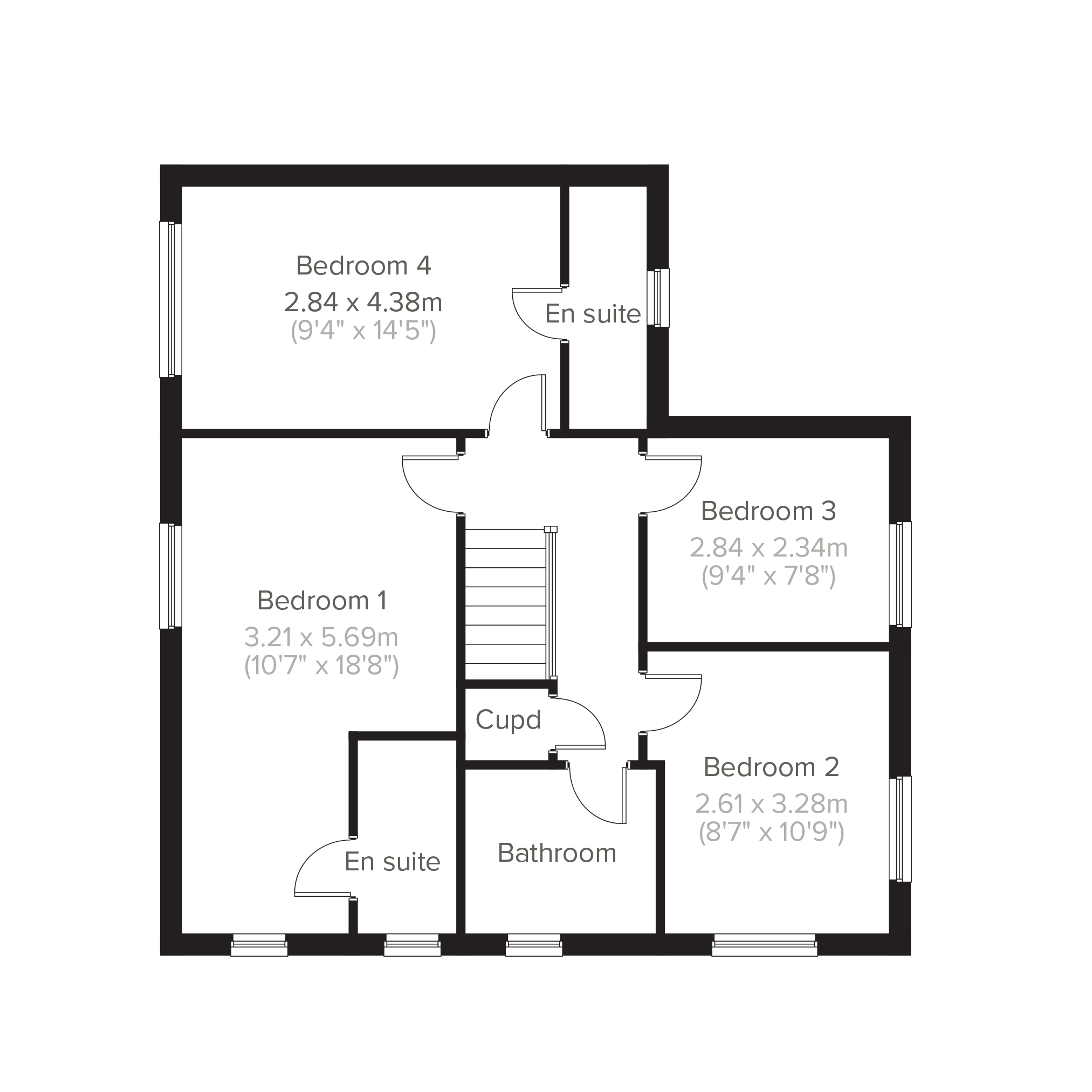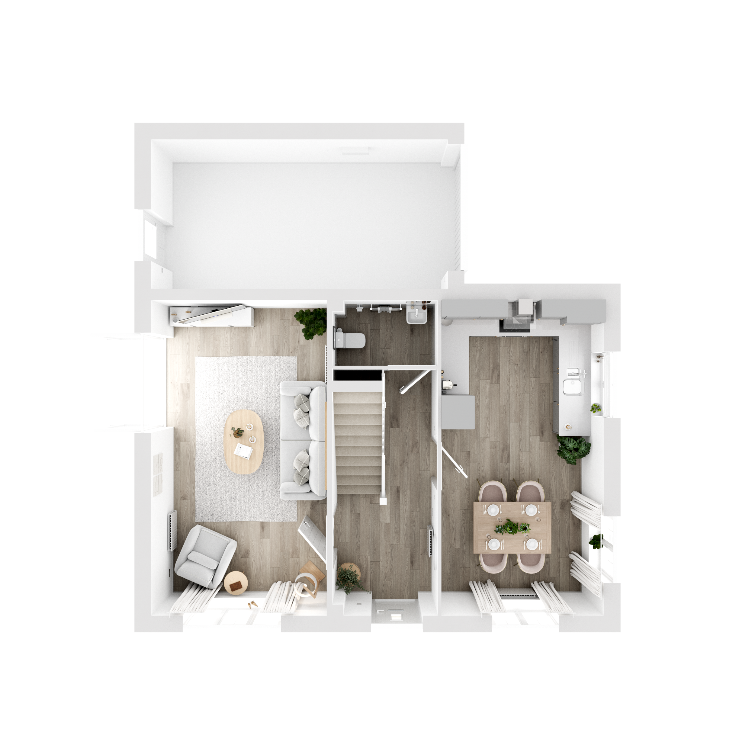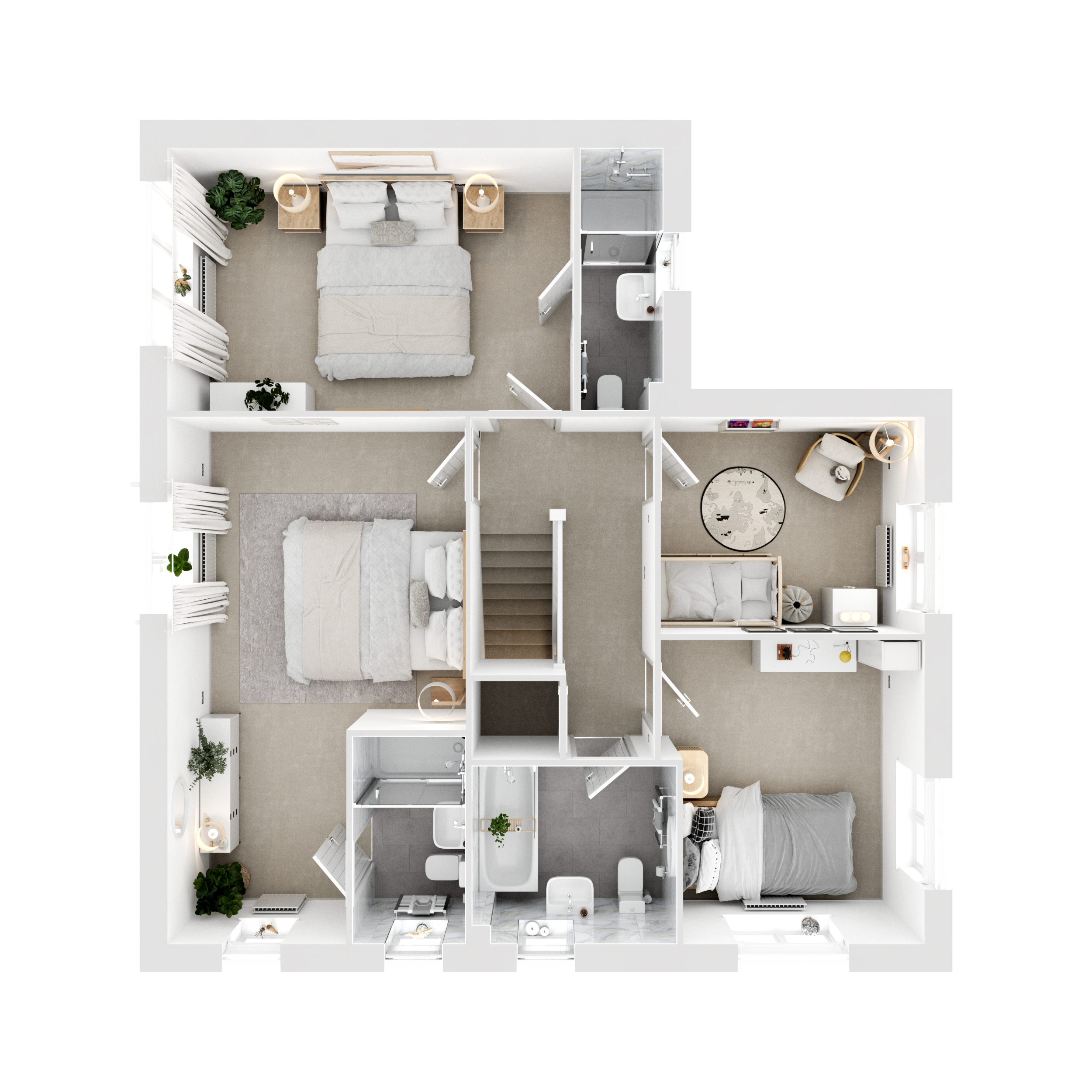 The Clandon+ is a four-bedroom, three-bathroom, detached family home with an integrated garage. Theres a dual-aspect living room, an open plan kitchen/dining room, a downstairs WC, and a storage cupboard in the hall. Upstairs two of the bedrooms feature en suites and the other two share a family bathroom. Additional storage on the landing is another practical feature.