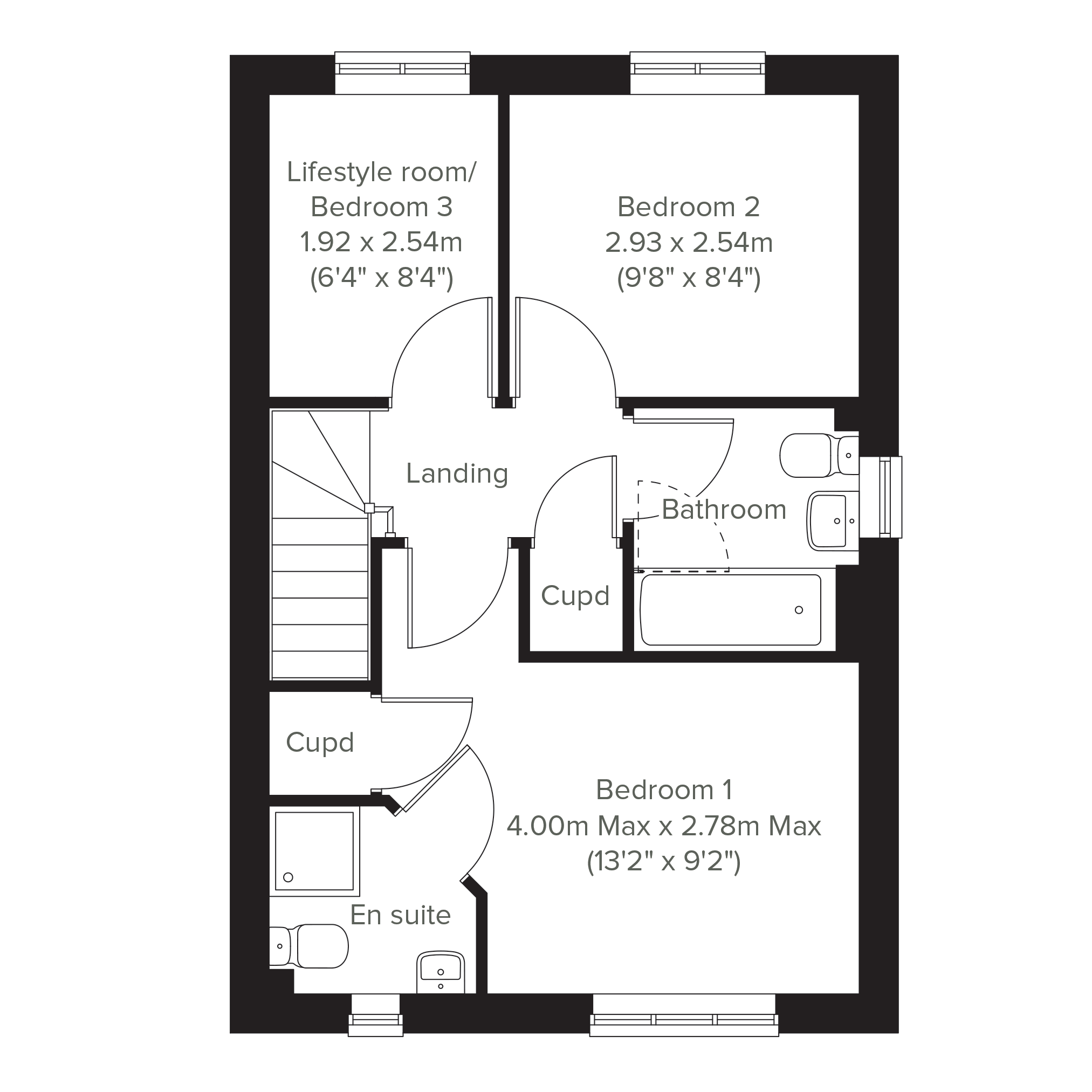 An attractive three-storey home, the Panfield has an open-plan kitchen/dining room, a living room and four bedrooms. The top floor bedroom has an en suite and storage cupboard.